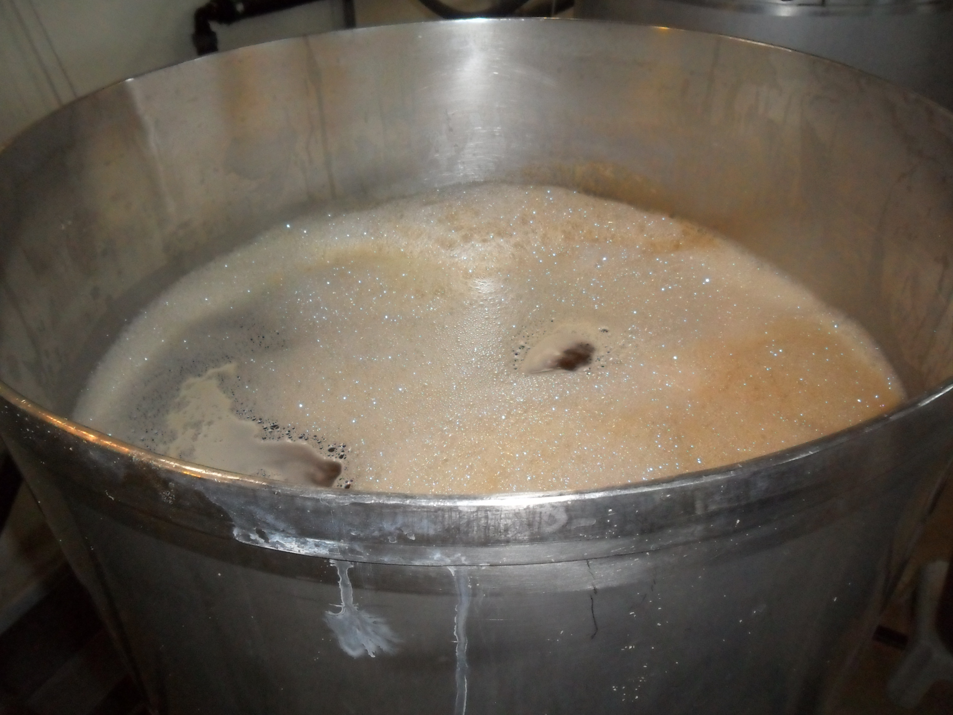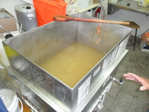 Next Gideon asked us if we wanted to see what he was currently making, a passionfruit wine (the one we smelled when we came in). He took us to his “kitchen” and showed us the vat of passionfruit juice.