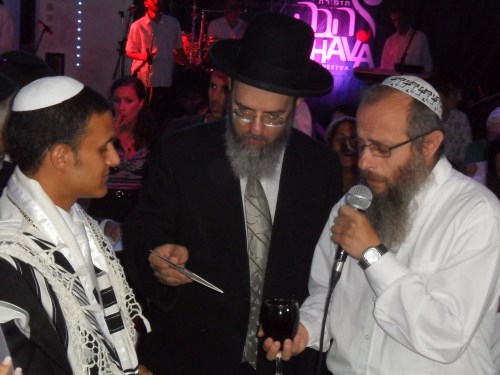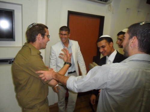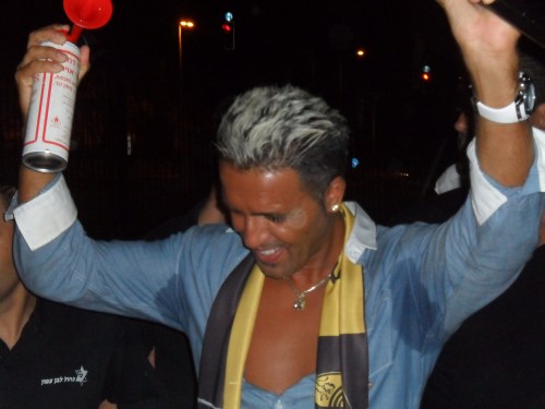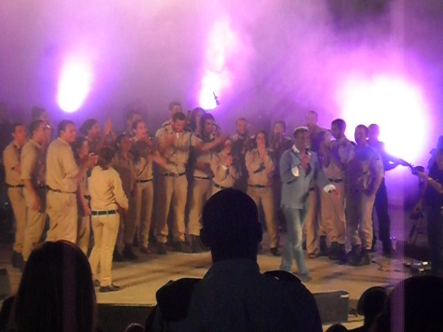 The soldiers stayed onstage forever until one of the security details hinted for them to walk off. People gave them thumbs-up as they walked back to their seats, each of them a star for a moment. Of course, Kobi Peretz also did stuff with the citizen attendees, he held a baby onstage and donned a scarf from one of the world’s soccer teams (sports eludes me so I do not know which team it was). There was also two children/teens in wheelchairs so he made a special effort to excite them too. With one he went over and gave a blessing that she should be up and dancing soon to which hundreds of people said “Amen” to. The other Kobi went up to him and spoke words of encouragement and sang a song special for the handicapped child/teen. The following picture was taken right at the wheelchair with Kobi Peretz making merry in front of the boy.