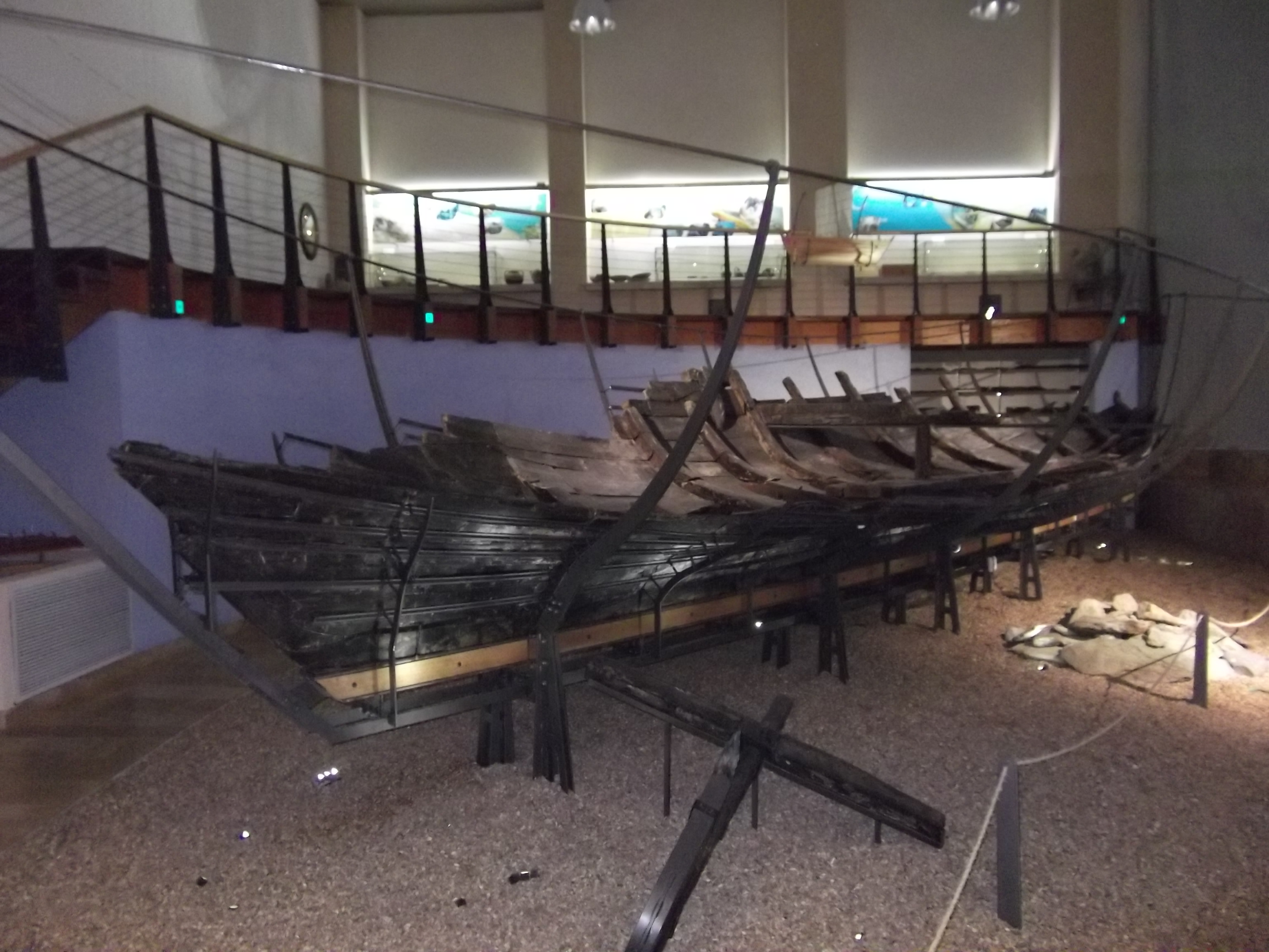 Through a doorway I found another, slighty different archeaological display. A Phoenician boat was found off the coast of Akko and resurfaced. The wood was preserved by layers of sand and the ballast stones that spilled out of the cargo. Very carefully the ancient ship was restored and rebuilt to the best they were able and now it sits high up on Mount Carmel looking out north towards what was once Phoenicia.