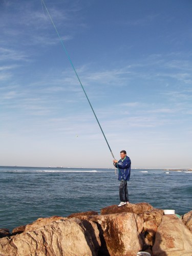 On the rocks that form a mini-seawall stood fisherman with immense fishing rods. I had the pleasure of watching one of the fishermen catch a fish, the myriads of huge beach cats lounging around just waiting for a snack. Here is one of these fishermen, sadly he did not catch anything while I was there: