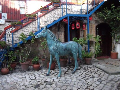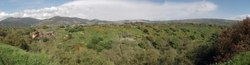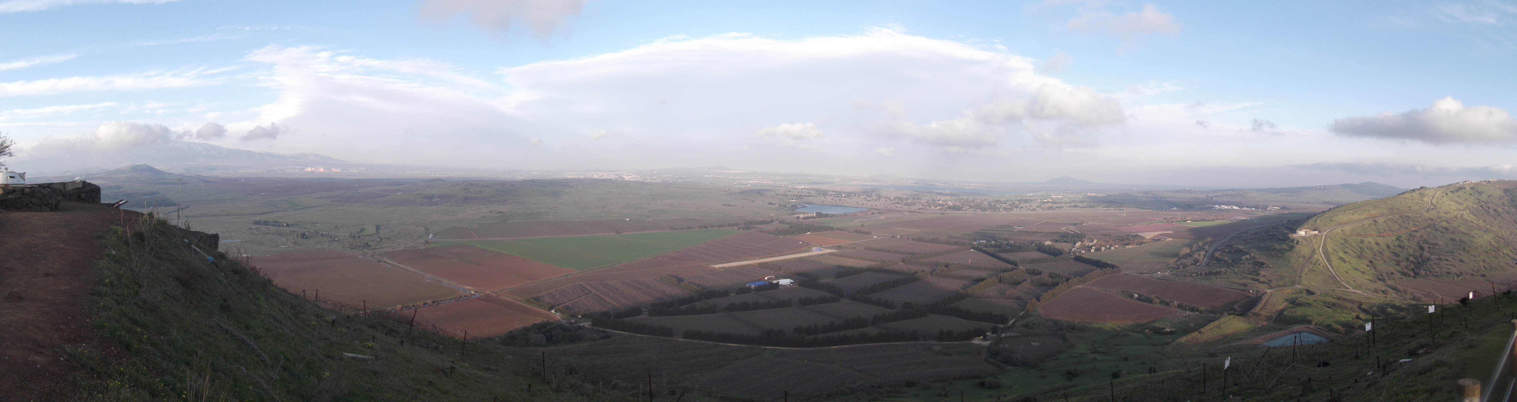 The drive up the mountain was far shorter than I had thought it would be and before long we were just minutes away from Coffee Anan (which really means both Kofi Annan the UN Secretary-General and “Coffee [of the] Clouds” – I don’t know if they had both in mind when naming the cafe). Along the way there were some interesting Dutch sculptures of welded metal and a section of a bunker. On the peak of the mountain we had an incredible view of the whole Golan from Mt. Hermon (which had gotten an inconvenient cloud-wrapping during our ascent) to the Hula Valley to the Israeli-Syrian frontier. Here is a panoramic shot of the valley area stretching out to Syria (click to enlarge, as always):