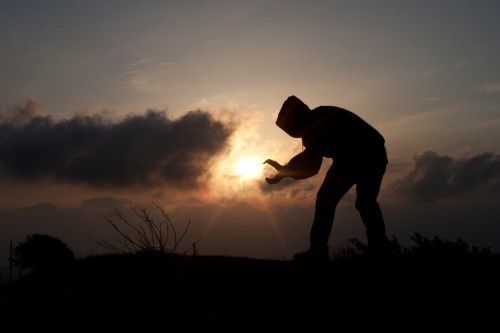 So after we absorbed the blood and tears of history we waited a short while for the clouds to pass over Mt. Hermon. But they were stubborn and thick and refused to leave, so we left instead. We drove to the far side of the mountain-top parking lot and rejoiced in the setting sun. When the clouds permitted us, we tried doing trick photography but the wind was also out to get us. As I would pose I would be blown over by the fierce, freezing blasts of cold air that reign dominant on mountain-tops. This is the best we got of me trying to hold the sun: