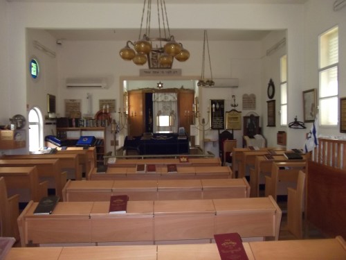 After much talk we bid the helpful archiver farewell, thanking him over and over for his interesting insights into the history of Shavei Tzion. But before we left, we stopped at the old Bet Knesset (Synagogue) – a building duplicated from the settlers’ counterpart back in Germany. Sadly the door was locked… but redemption came in the words of an Arab cleaning woman. She told us where to find the keys and then reminded us that we needed to return them when we were done. We assured her we would and opened the synagogue. Here is what we saw, definitely of Germanic design: