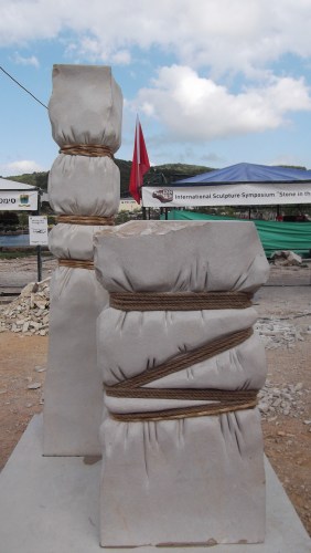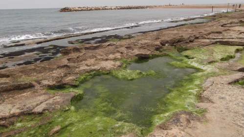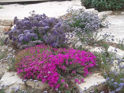 To find the reported mosaic excavation which we had read about some months back, we had to leave the beach and ask around. After questioning a bunch of people, and getting wildly conflicting answers, we finally were pointed in the right direction. It was to be found along the beach, 100 metres or so from the waterline and just a little further north than where we parked originally. Returning to the beach, we walked along a very nice path, the sandy area blossoming with wildflowers:
