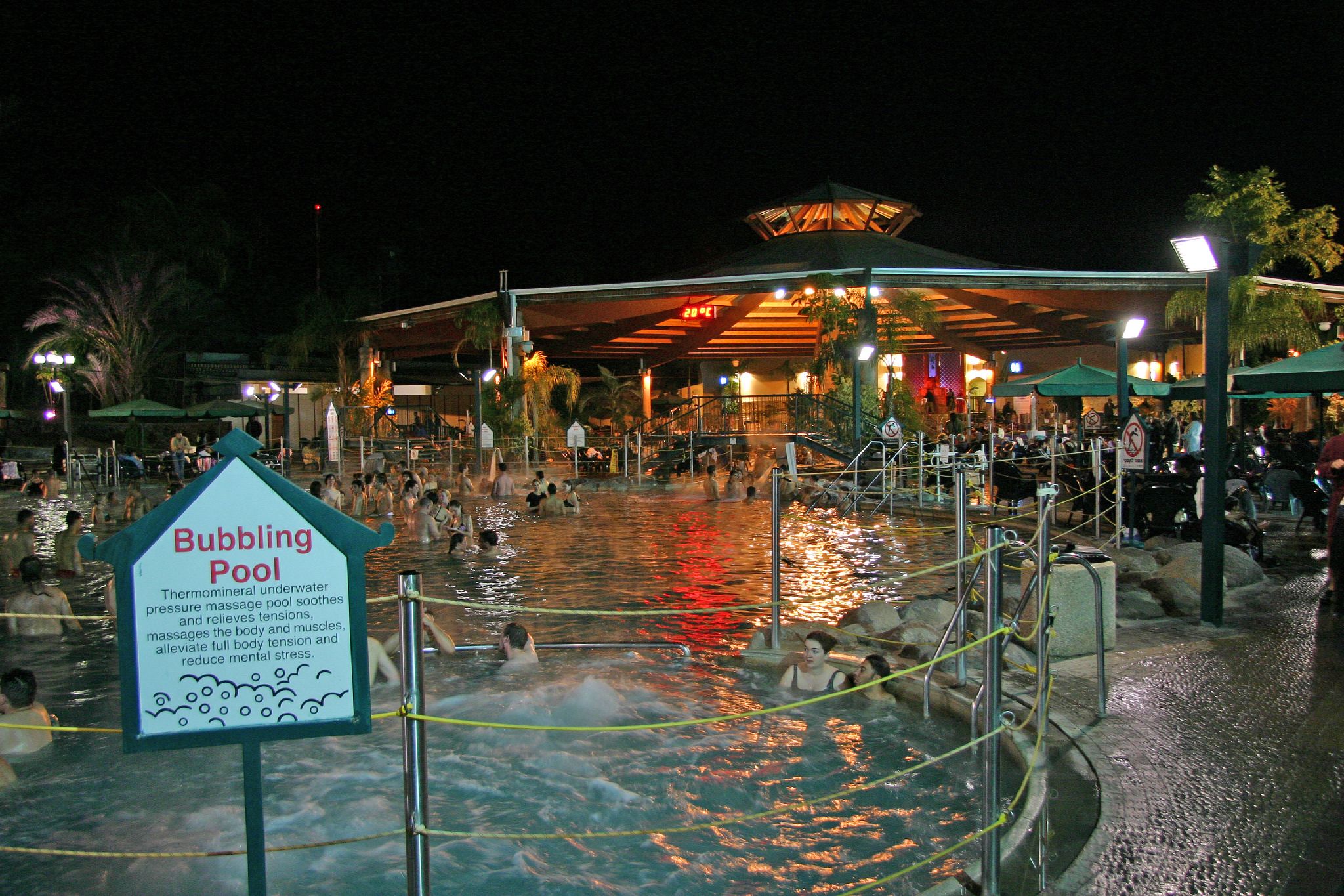 The springs itself are divided up into a bunch of separate pools, some in the sun, some shaded and some indoors. When I got a locker and put on my bathing shorts I headed first for the indoor one. It was so hot I couldn’t believe people actually liked going in. I’m not sure, the water is either 42 or 52 degrees Celsius (108 or 125 degrees Farenheit) – either way, there was a warning on the wall not to exceed ten minutes in the water at once. I stayed about seven and then fled (is that what lobsters feel like?). The outdoor sunny pool was a cooler temperature but still a hot thermal spring. I eventually made my way to the shaded section and sat comfortably with one of the jets attacking my back. For those who have never been around thermal springs, they smell really strange (borderline bad) but eventually I got used to the odor. I didn’t really get a good photo of the pools so I had to find this one on Flickr, I know its a nighttime shot but it still gives an accurate description of the area.