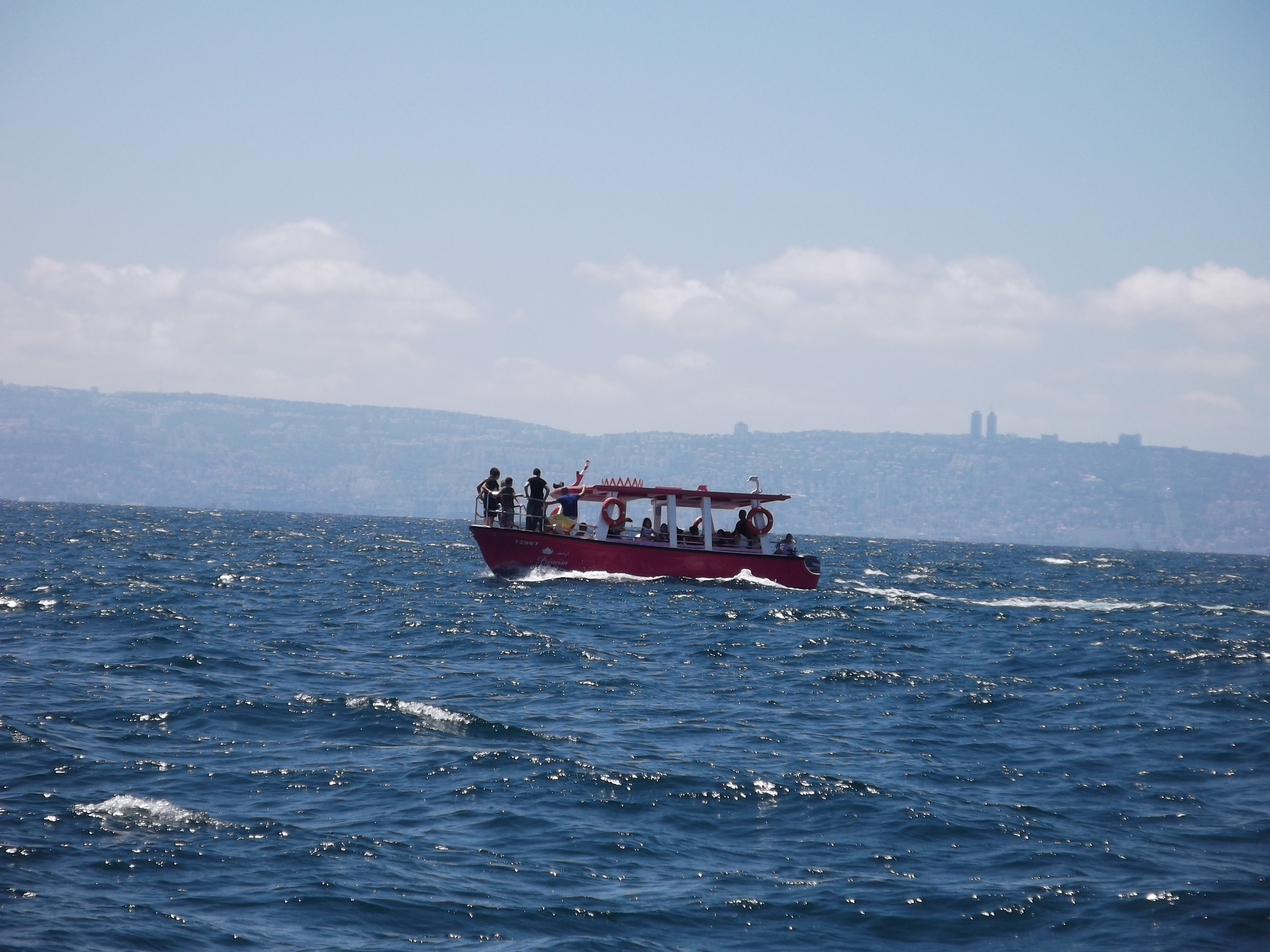 As we went out, passing the domain of the sea walls, our eardrums cringing from the overpowering music – the classic Arabic songs are all the same to me, one man singing and then a chorus of a bunch of men partially repeating what the main singer said (something like this song, blasted at 100 decibels). If you listen to the song at full volume, rock back and forth and splash salt water on your face from time to time, you may begin to feel what the boat ride is like, with the help of a healthy imagination! Here is another tour boat passing us on its return journey, Haifa and the famed Mount Carmel in the distance: