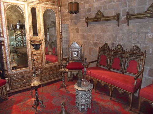 Located beneath the wall, in arched rooms, is the Treasures in the Walls museum (also known as the Ethnography and Folklore Museum) – various collections of historical items and artifacts. There, in compartmentalized exhibits, workshops and offices have been recreated all using period pieces. A shoemaker, a carpenter, a pharmacist and a hat-maker (or as the man referred to himself: casquettier), all these workshops and offices, and many more, were faithfully redone with the finest attention to detail. Also, there were collections of old toys, old matchboxes, old currency (spanning four nationalities in the Holy Land during the last century and a half) and even old sitting rooms of imported furniture from Damascus, Syria. Here, a collection that would befit a palace – wood inlaid with bone and seashell: