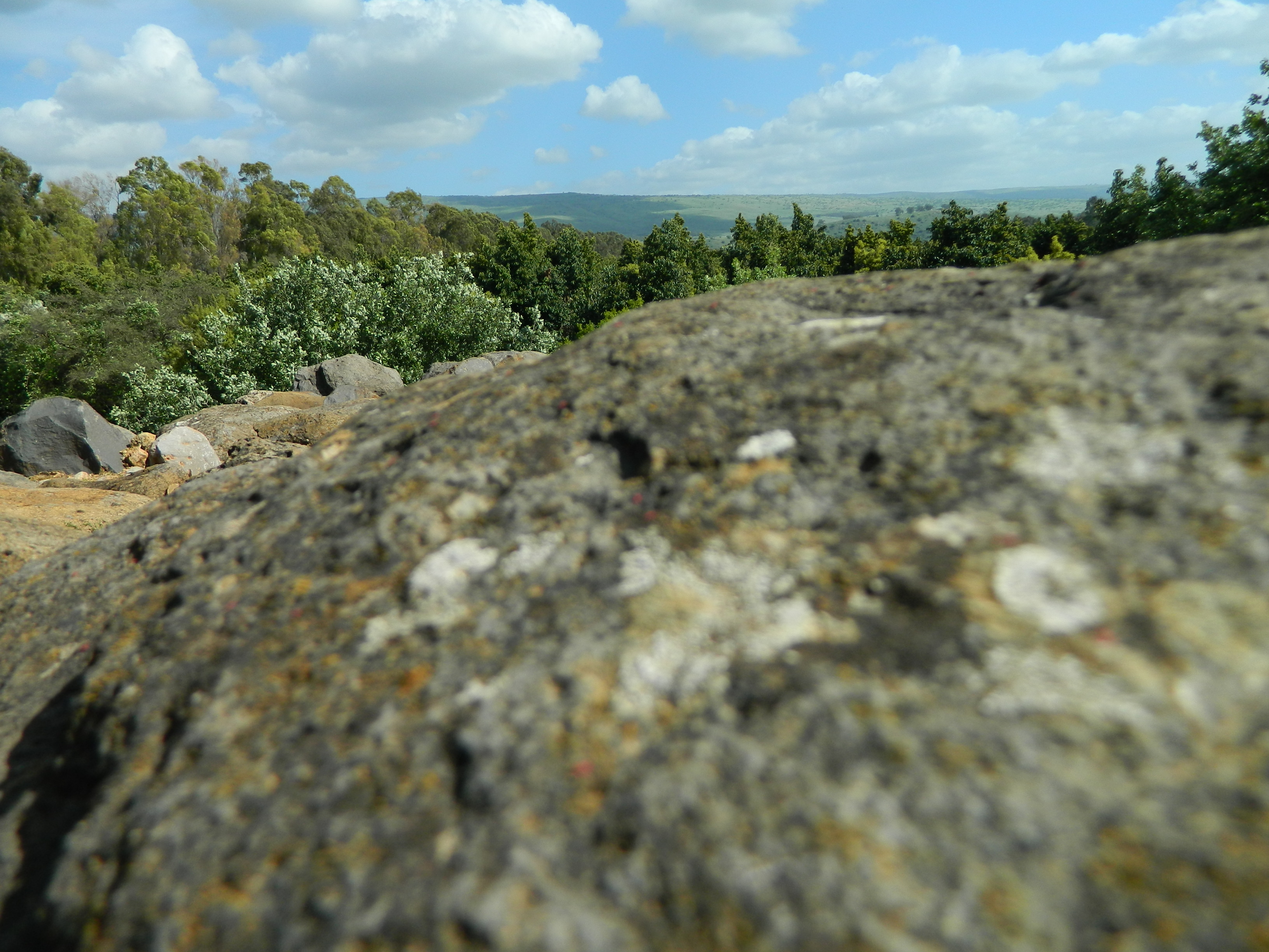 I also played with zoom and focus, using the great landscape to capture deep photographs. Here, a lichen-covered rock, belonging to an ancient wall in the Israelite Gate, and the rolling levels of trees in the background: