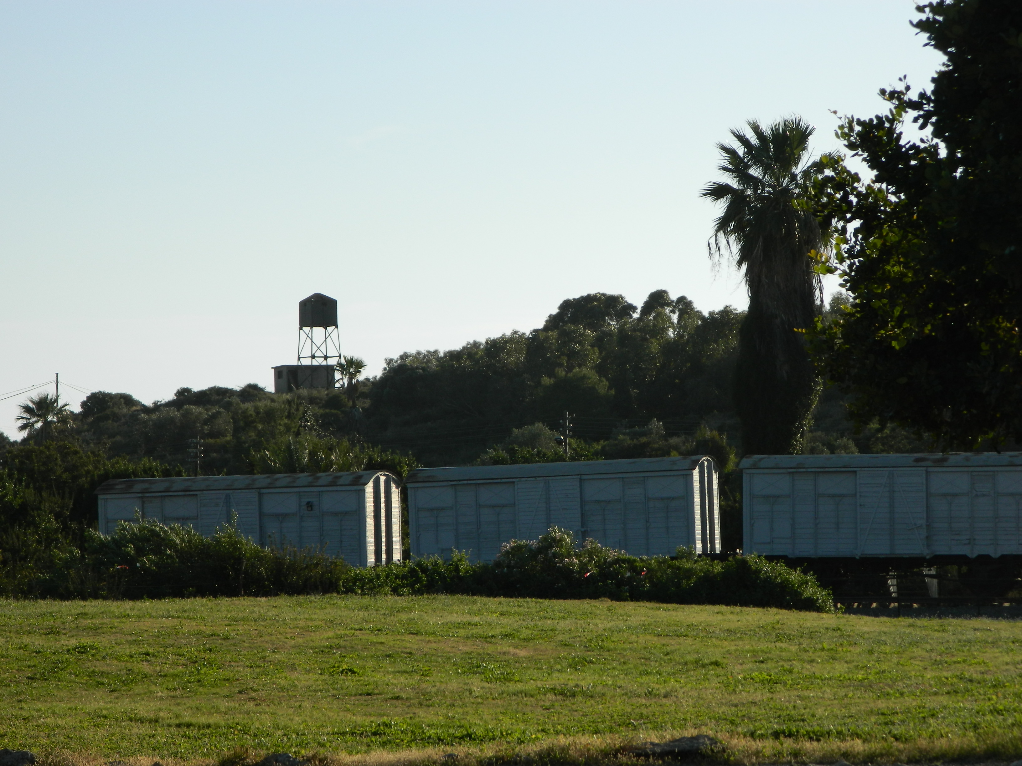 To relay a brief overview of the site, the Atlit camp was built in the late 1930s by the British to hold the refugees flooding in from Europe, before, during and especially after the war. After stopping the clandestine immigration ships out at sea, the British would often detain the wannabe immigrants and so the camp at Atlit began its years of service. With new people continuously coming, the British would let people go from time to time. Here is a aerial model of the camp and the train tracks, with the guard towers on the low sandy hill in between:
