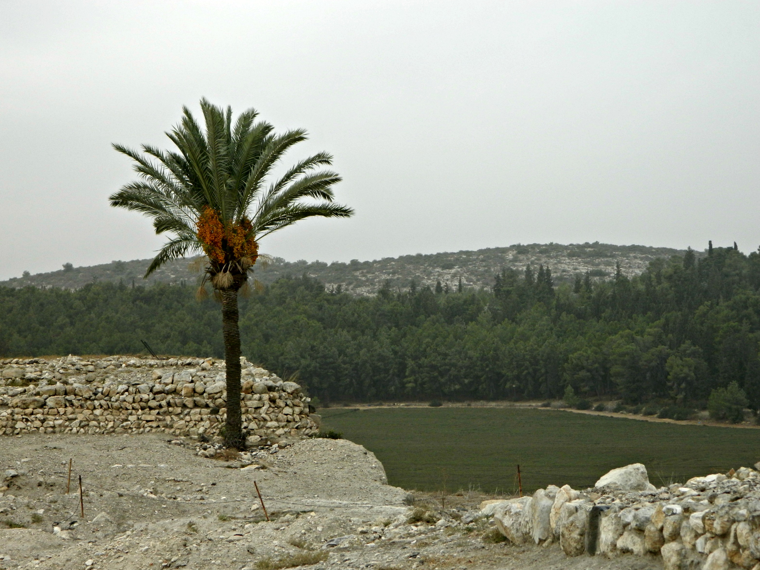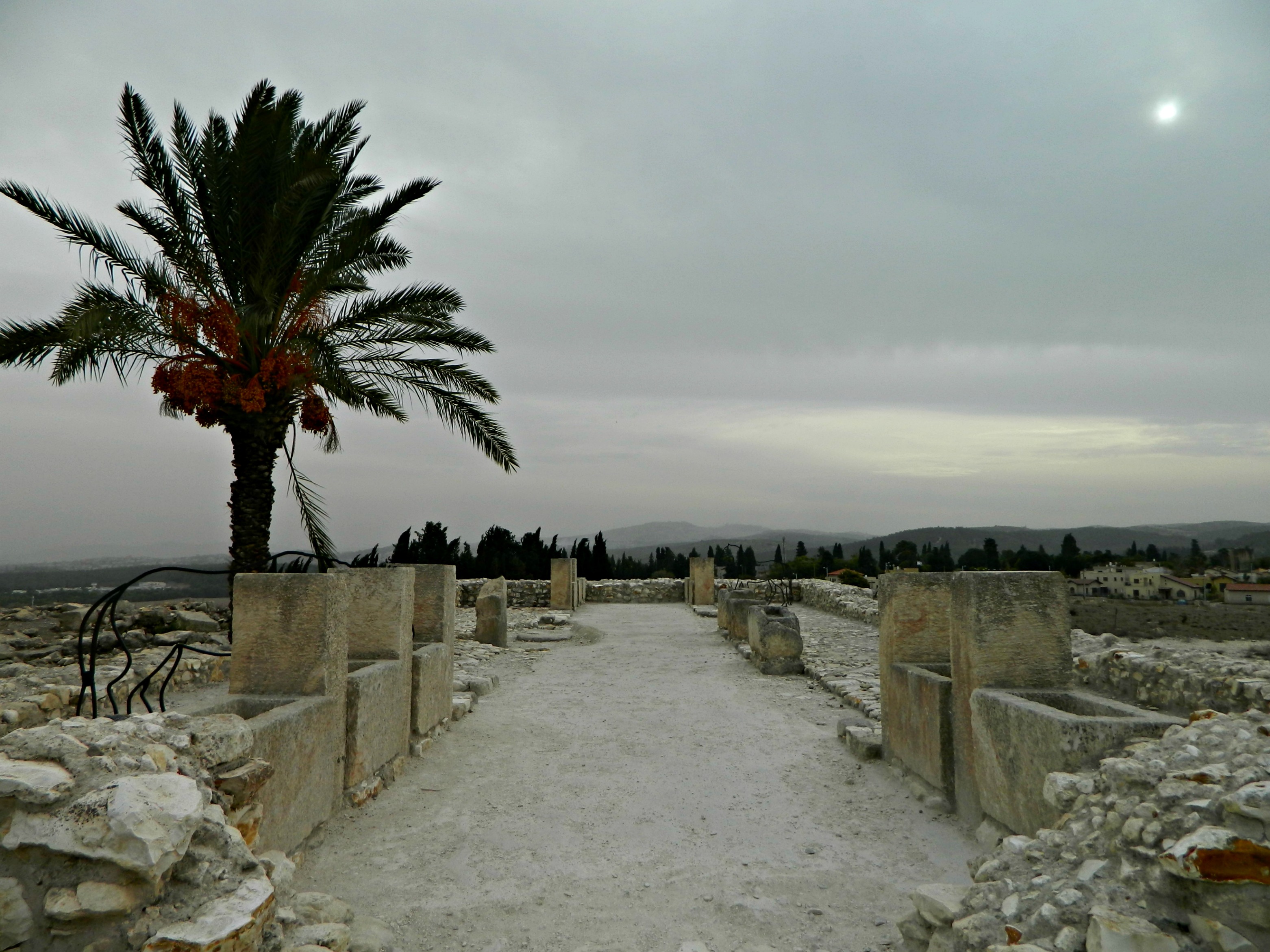 At the far eastern side of the ruins, looking over the Jezreel Valley towards Mount Tavor, the wind played a haunting tune as it whipped through the thin reed-like awning covering the lookout. There, gouged deep through the archaeological mound, many time periods can be looked upon at once – layers built up on the bedrock. Not far is the 450-cubic metre grain pit, lined with stone and straw, believed to be from the days of King Yeruvam (Jeroboam) II some 2,700 years ago. And then, on the western side of the hilltop are the stable complexes. Large to hold nearly 500 horses, the early excavators in the 1920’s and 1930’s believed the lot to be stables however more recent archaeologists suggest that the stables are actually warehouses or barracks. I personally like the stables version, and so does the Israel Parks Authority because many metal horses can be seen on premises, such as the one hiding under the date palm: