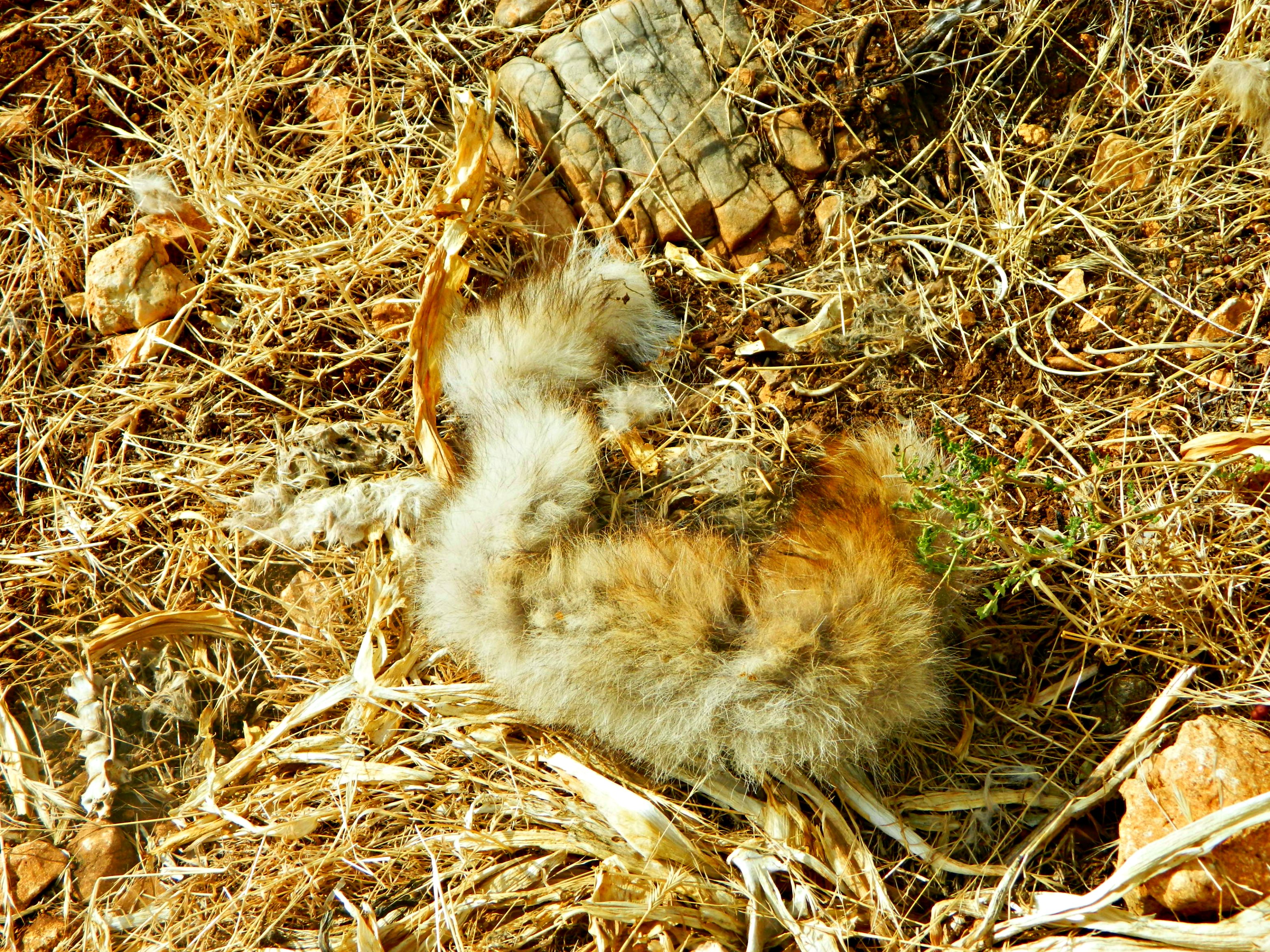 As we walked we began speaking of caves and Nechemya tried to recall where along the side of the ridge he found a big cave on a previous hike. And so we dropped down the side of the ridge, making our way over and around huge rocks, thorn bushes and more. After a while I began to appreciate the small thorn bushes; they made great footing to step on for going downhill. Then we came across some torn up fur littered all over, from a fox or jackal.