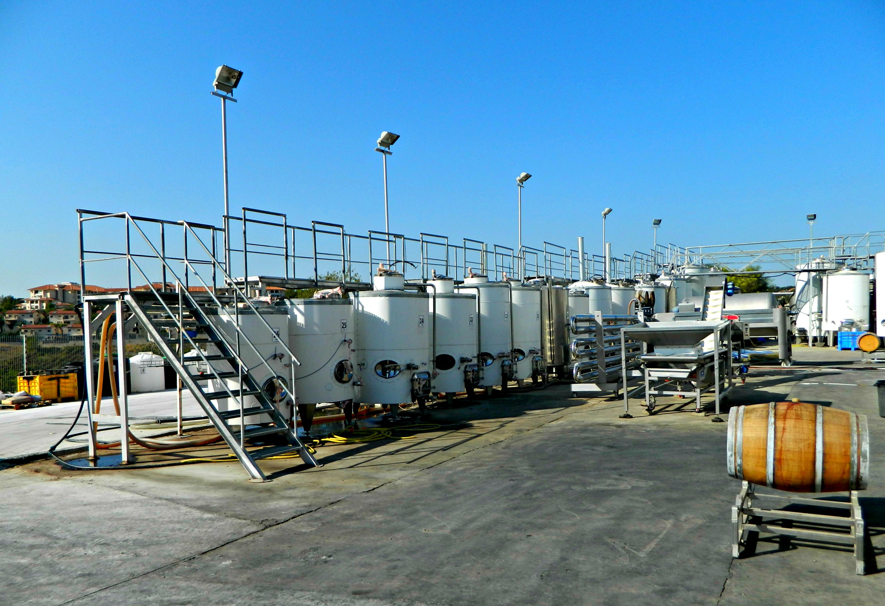 After snacking on some grapes we headed down to his workshop and his rooms. Using a clever, yet simple, concrete structure, the winery’s various stations and the new deck is all in one spot, overlooking the vineyards, a water reservoir and the distant Mount Carmel. Ro’i showed us his latest batches, one just starting the fermentation process, kept in large temperature-controlled metal casks. Using little stepladders, Les and I poked our heads into the casks to examine the crushed grapes.