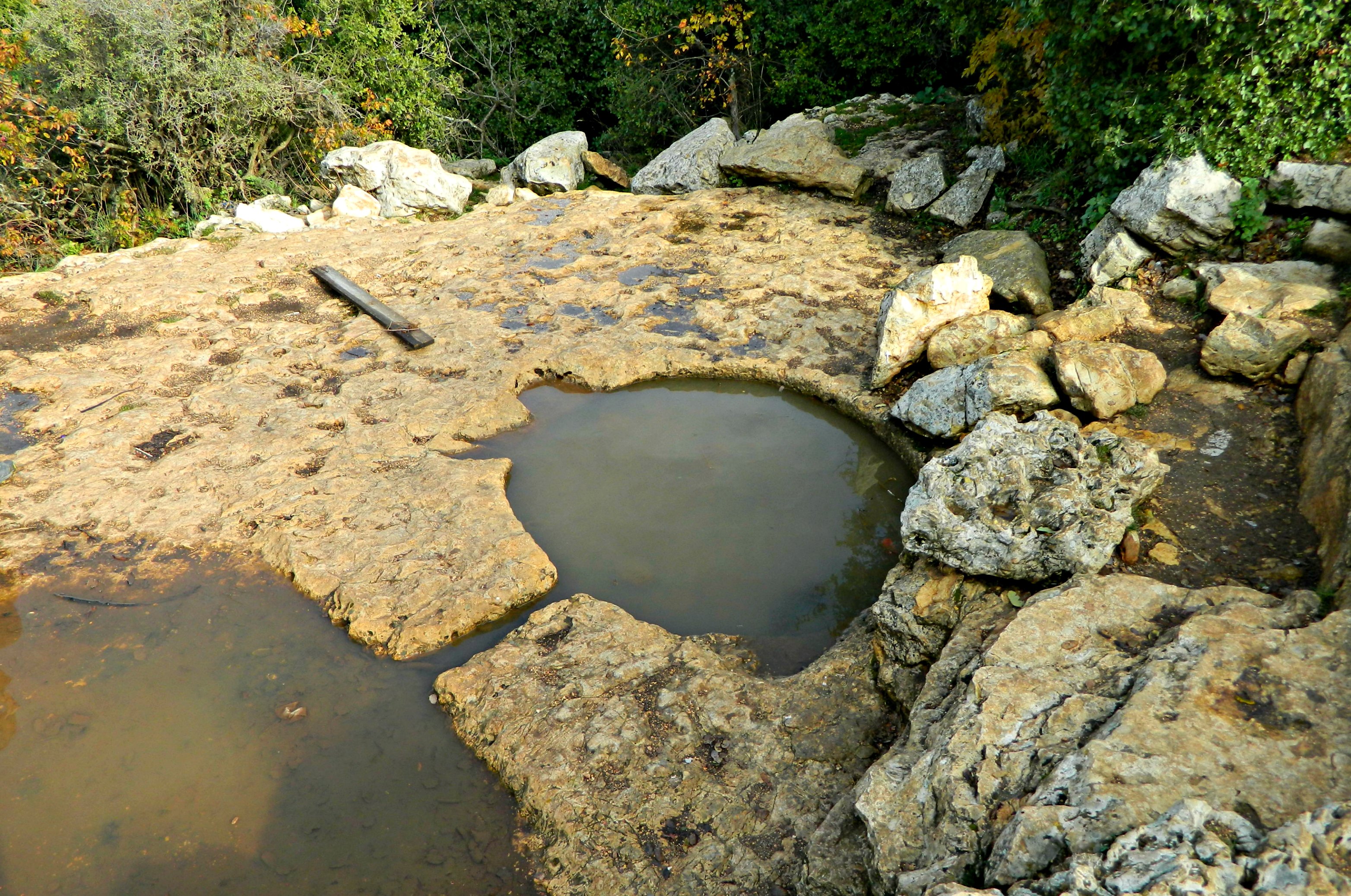 Just a wee bit along the path we came across the remains of an ancient winepress cut into the mountain bedrock. The grapes would be manually crushed on the left while the juices would flow into the carved cistern on the right. Today, muddy water replaces grape juice and fire salamanders use this pool as a breeding sanctuary (these salamanders are more often associated with Tel Dan). We watched as the tiny salamander tadpoles swam around the murky pool, but trying to capture them on camera proved to be tricky.