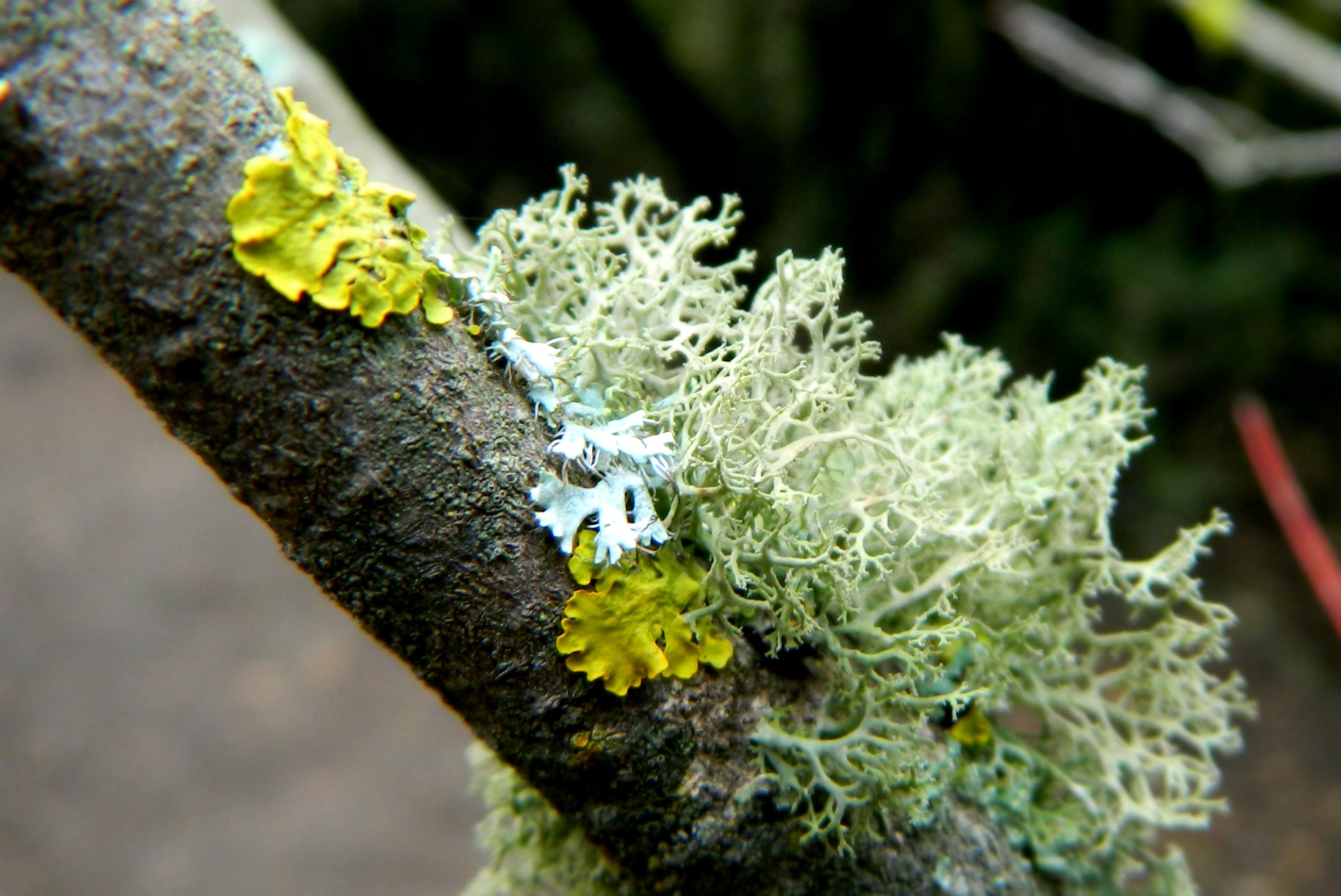 And looking even closer on a different branch, here is lichen and moss growing side-by-side, byproducts of the damp environment: