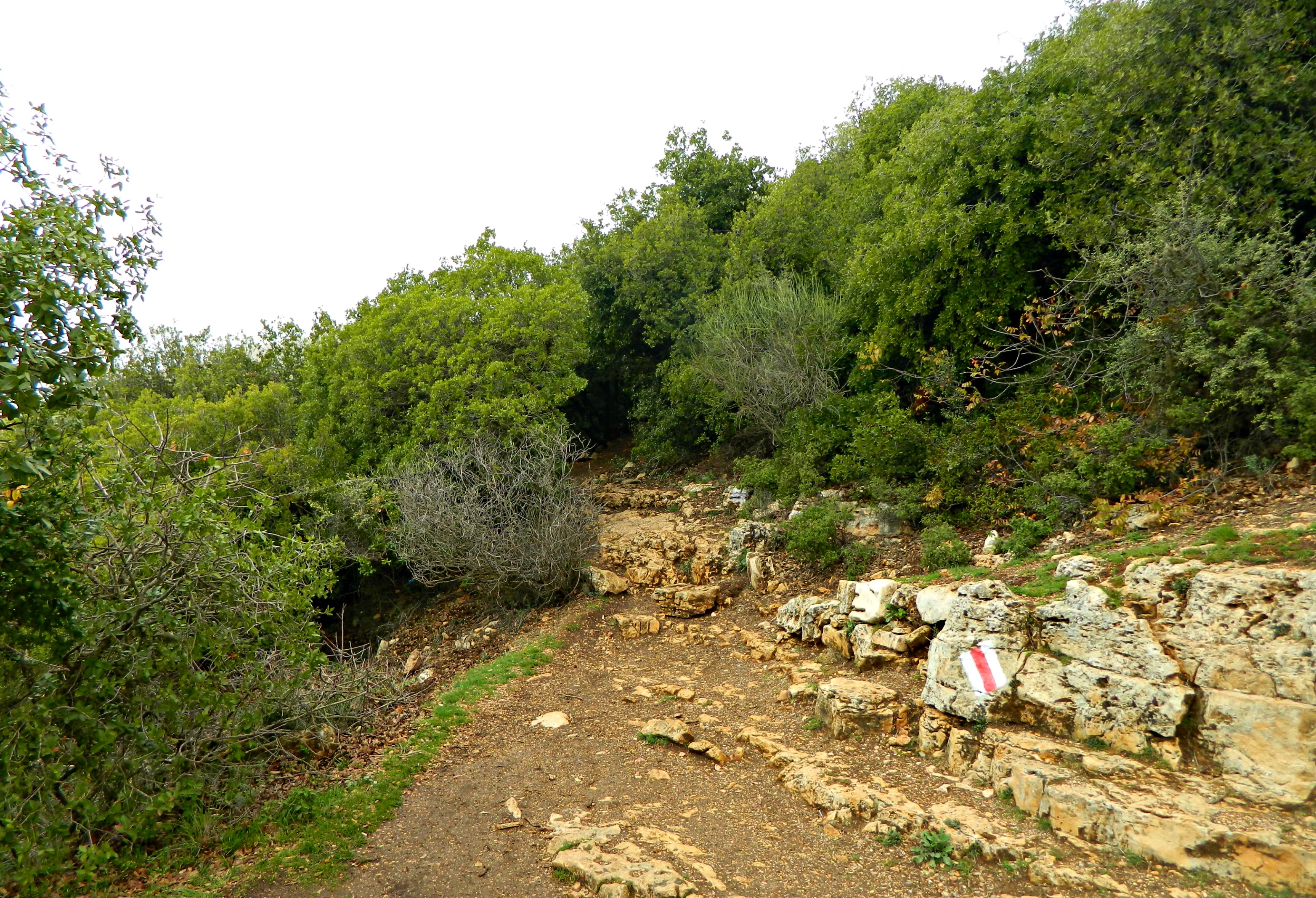 Crossing the access road, we began the circular trail around the peak. There is a military base at the very peak and the trail wraps around it, marked as both the peak trail and the extensive Israel National Trail (which begins at Tel Dan and ends in Eilat, approximately 1,000 kilometres long). Thankfully, the peak trail is just a mild 2 kilometres long – perfect for families. Before long we reached the first observation point, looking out to the east. Although it was too cloudy to see anything, the sign mentioned that one can see Mount Hermon, Mount Bental, Safed as well as the Kinneret (Sea of Galilee) – pretty impressive.