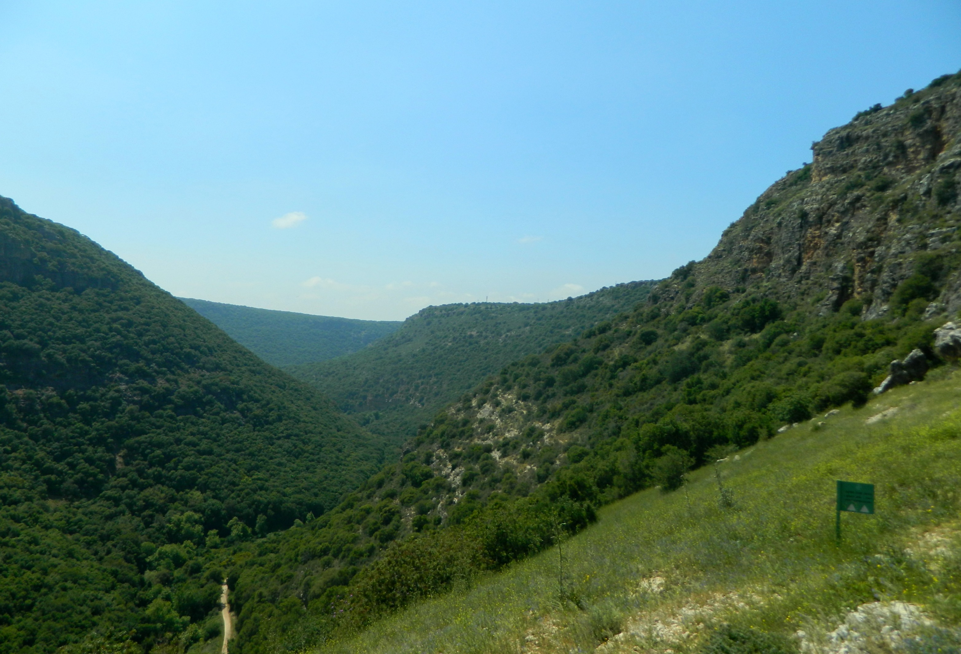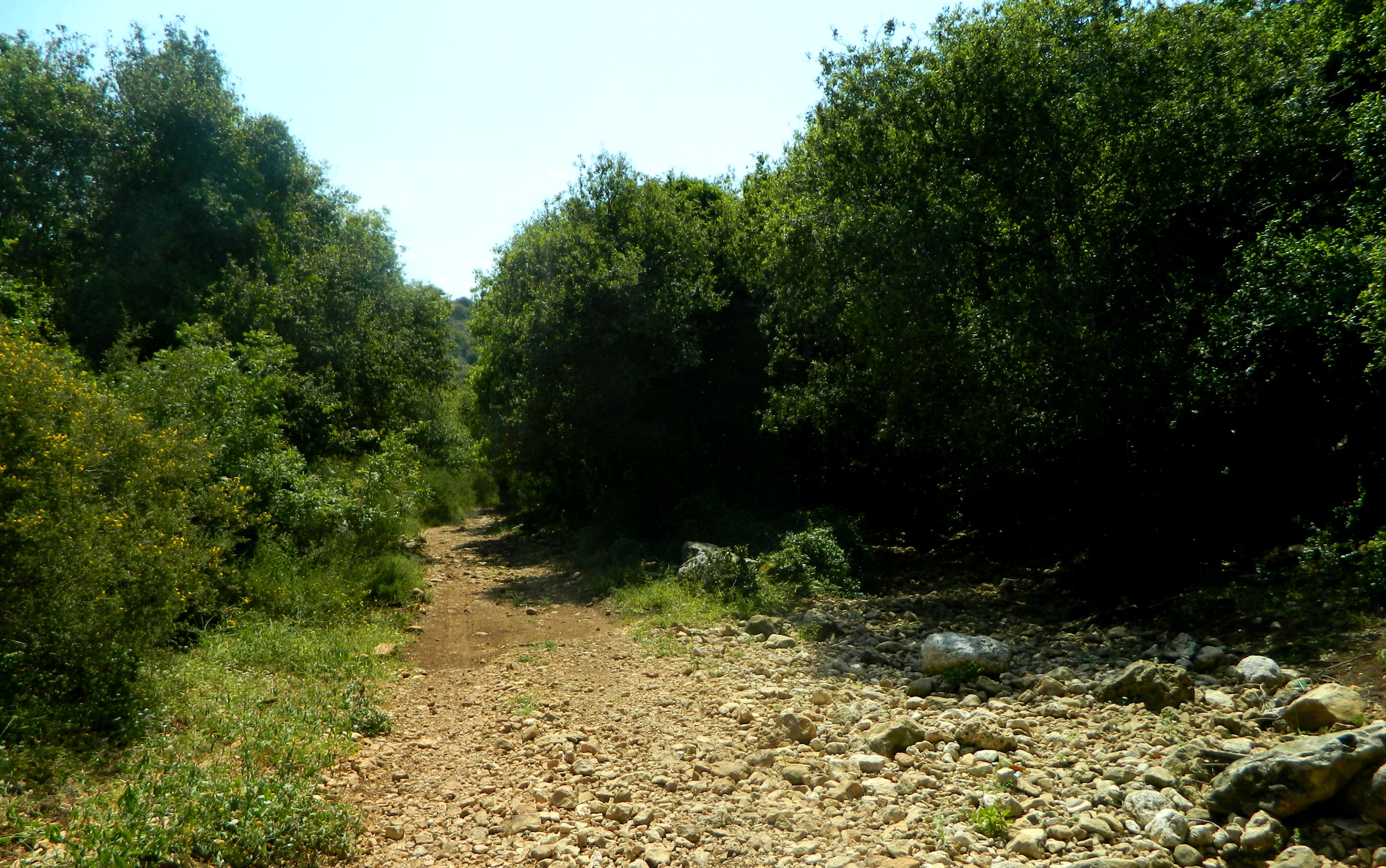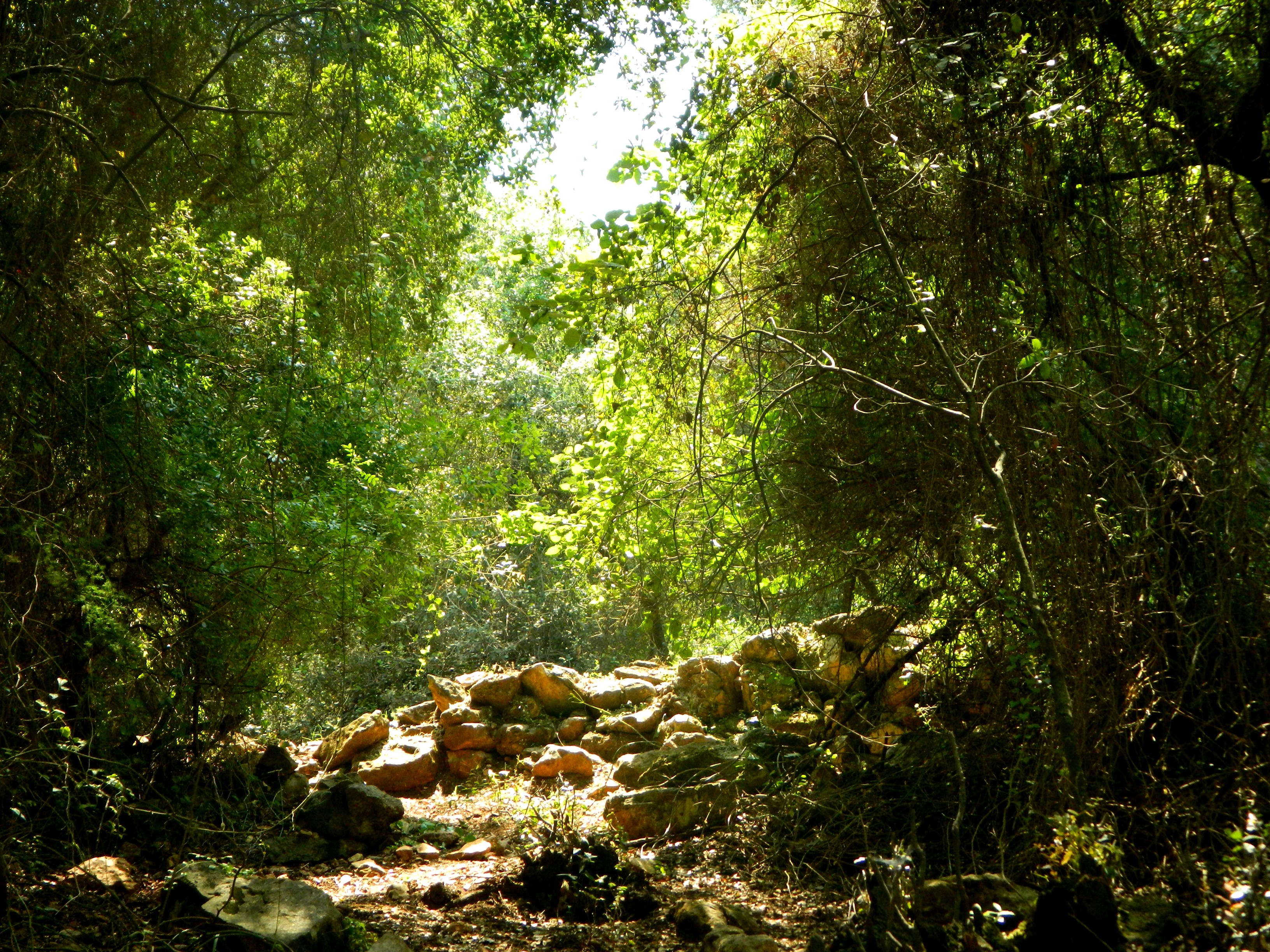 Last week’s adventures took me to the nearby Nachal Ga’aton, a small stream that starts seasonally between Mi’ilya and Meona and drains into the Mediterranean in the heart of Nahariyah. Being that Meona and Mi’ilya are neighbors with Ma’alot here in the Galilee, my father easily dropped me off in Meona and I began my 13-kilometre hike in the industrial section of the town. Eager to leave the rank smell of chicken coops behind me, I skipped some interesting little things to see, hurrying along on the paved road. It was when passing a mushroom manufacturing plant that I finally got on the Nachal Ga’aton trail (marked blue). Immediately descending into the woods, the trail followed the dry Marva stream (below Tel Marva) until it reached the dry Nachal Ga’aton.
