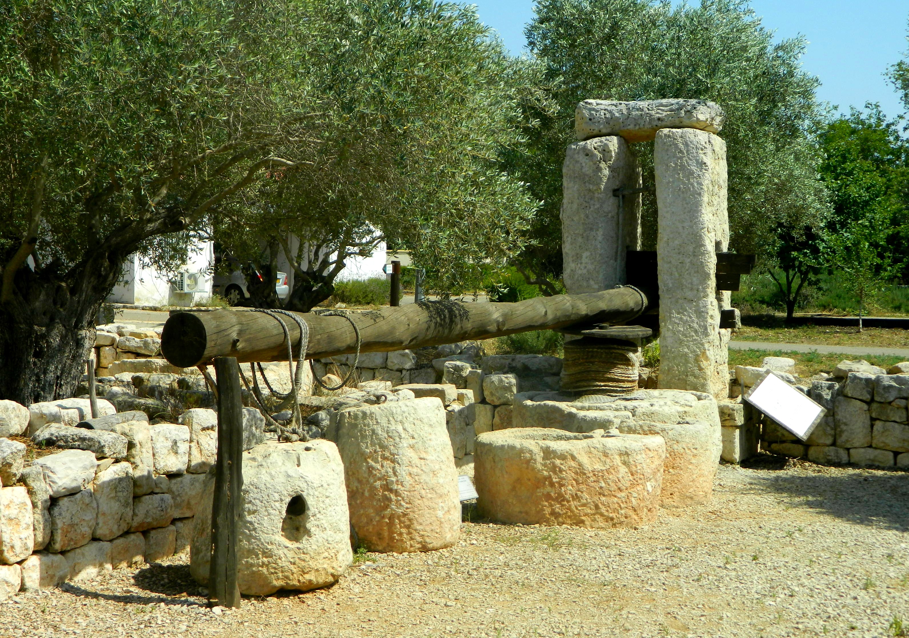 Soon I reached netted banana fields flanking the trail, and then, just half a kilometre from Road 70 and the Kabri Junction, I came upon the Western Galilee Regional School and swung north on the access road to visit the last two things on my mental checklist. The first was the KKL-JNF Kabri Archaeological Park, which is free to visit although they prefer prior reservations. Inside I found three themes of artefacts: olive oil, corn and wine. The largest is the olive oil section, with many grindstones and presses from different time periods and locations including a reconstructed Roman-era olive oil press from the Zabadi ruins just 5.5 kilometres north near the Old Northern Road.