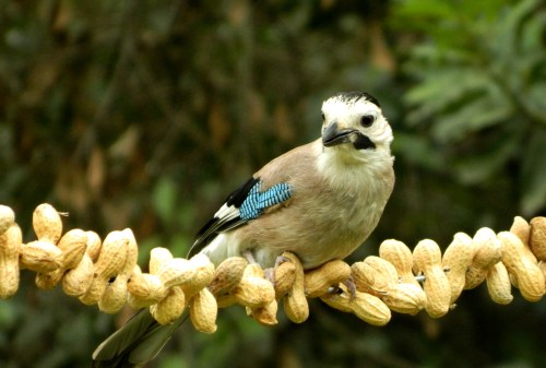 Shortly thereafter, as the three of us continued to notice new birds appearing in our field of view, one of the women who work at the JBO went out to refill the seeds in the bird-feeders and to string fresh lines of peanuts. Keeping my camera focused on one of the bird-feeders I tried time and again to capture a great tit snatching sunflower seeds, but to no avail. I did, however, catch this Eurasian jay perched on the peanut line moment before he wrestled one off for consumption.