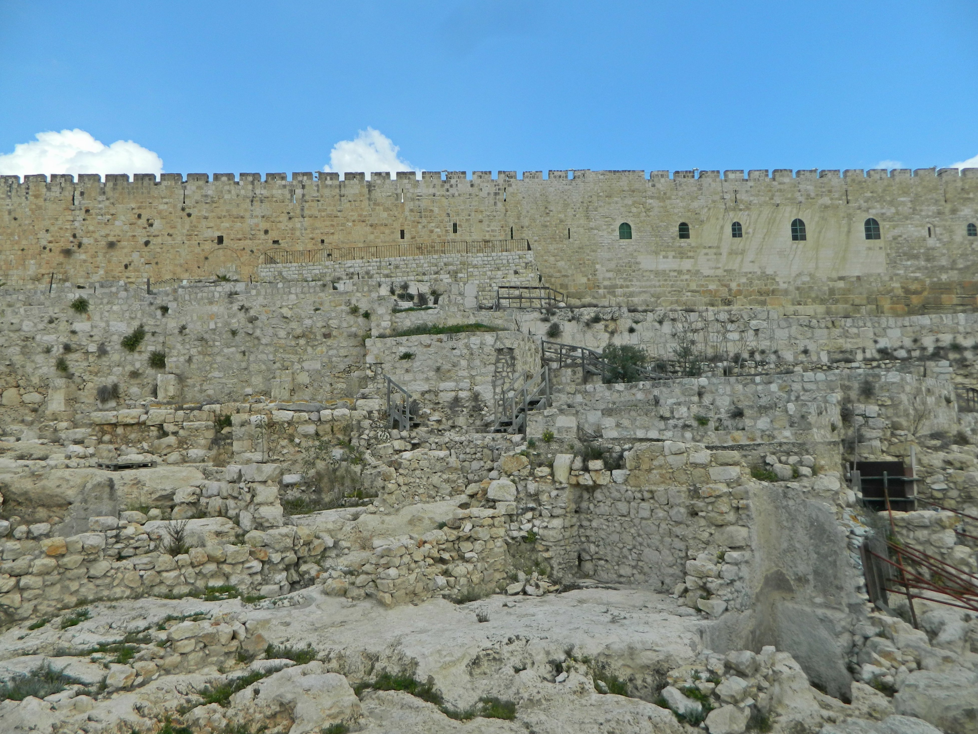 We stopped at the Ophel area, a complex of fortifications including walls, towers, cisterns and rooms. The discovery of what appears to be another four-chambered gate, Jewish construction characteristic of the First Temple Period, was the highlight of the recent excavations, perhaps having been built by King Solomon himself. Another neat discovery was that of twelve large clay jugs known as pithoi, one with a Hebrew inscription, which are dated to the destruction of Jerusalem by the hands of the Babylonians in 586 BCE.