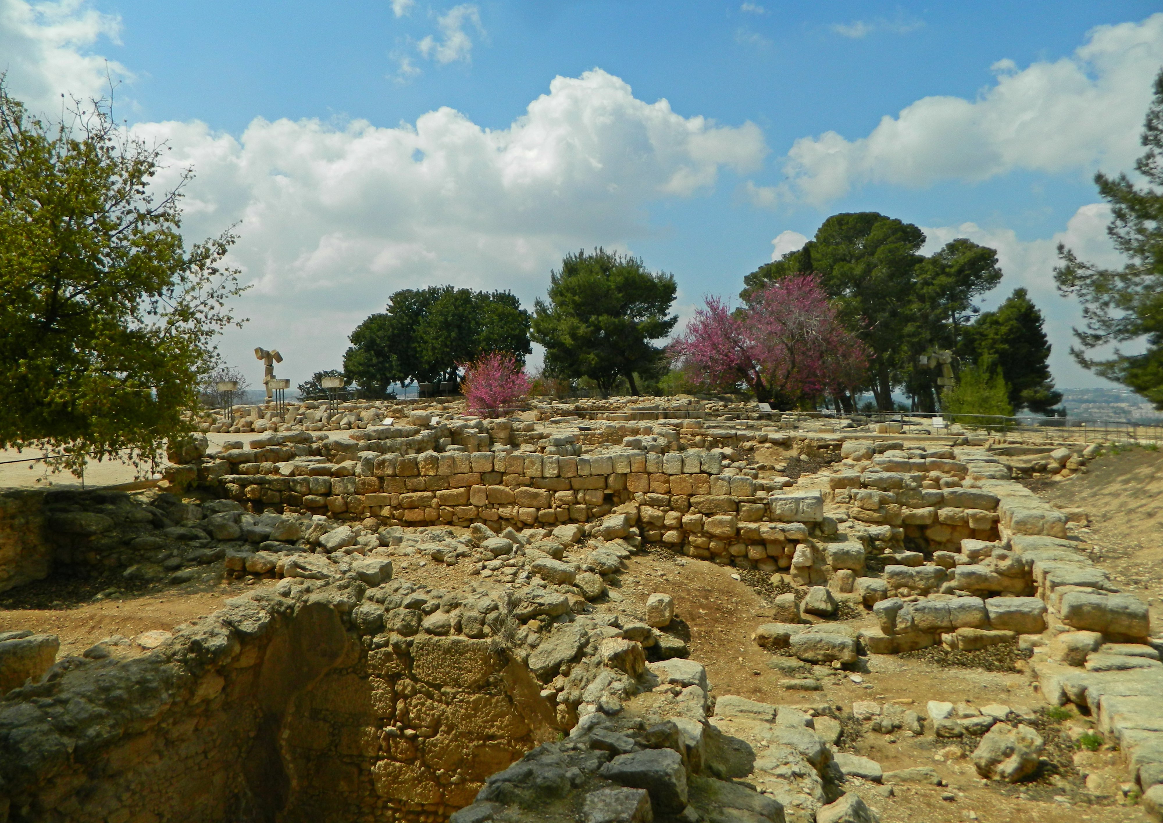 Interestingly enough, one of the most recent discoveries at Ramat Rachel was the uncovering of a skeleton wearing a helmet – presumed to be a Jordanian soldier. There was a pleasant presence of nesting jackdaws and an abundance of wildflowers such as lupin, hairy vetch and prickly alkanet as well as blossoming Judas trees which brought joy to us all. But the clock was ticking and it was time to venture on over to our final destination, Rogem Site.