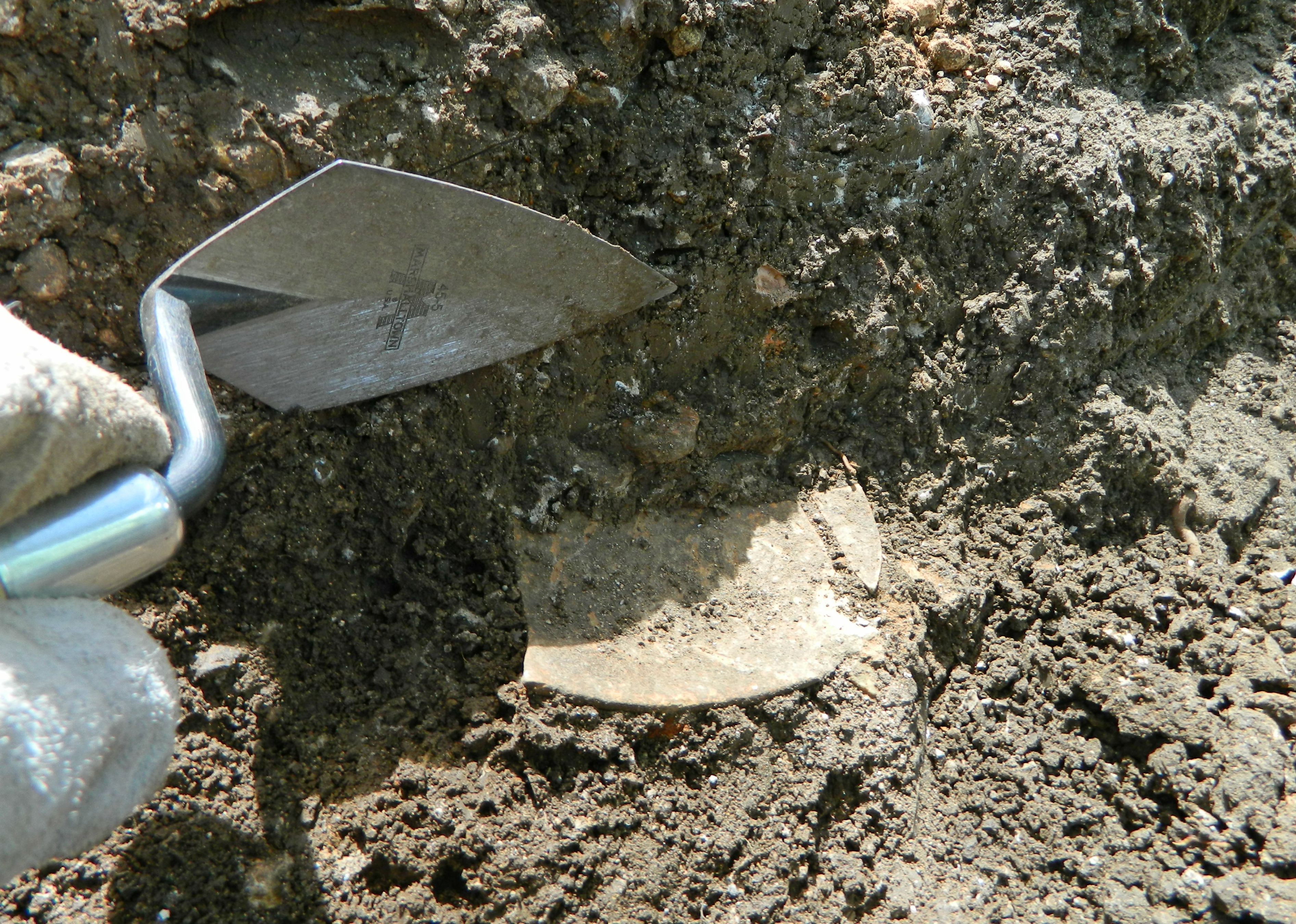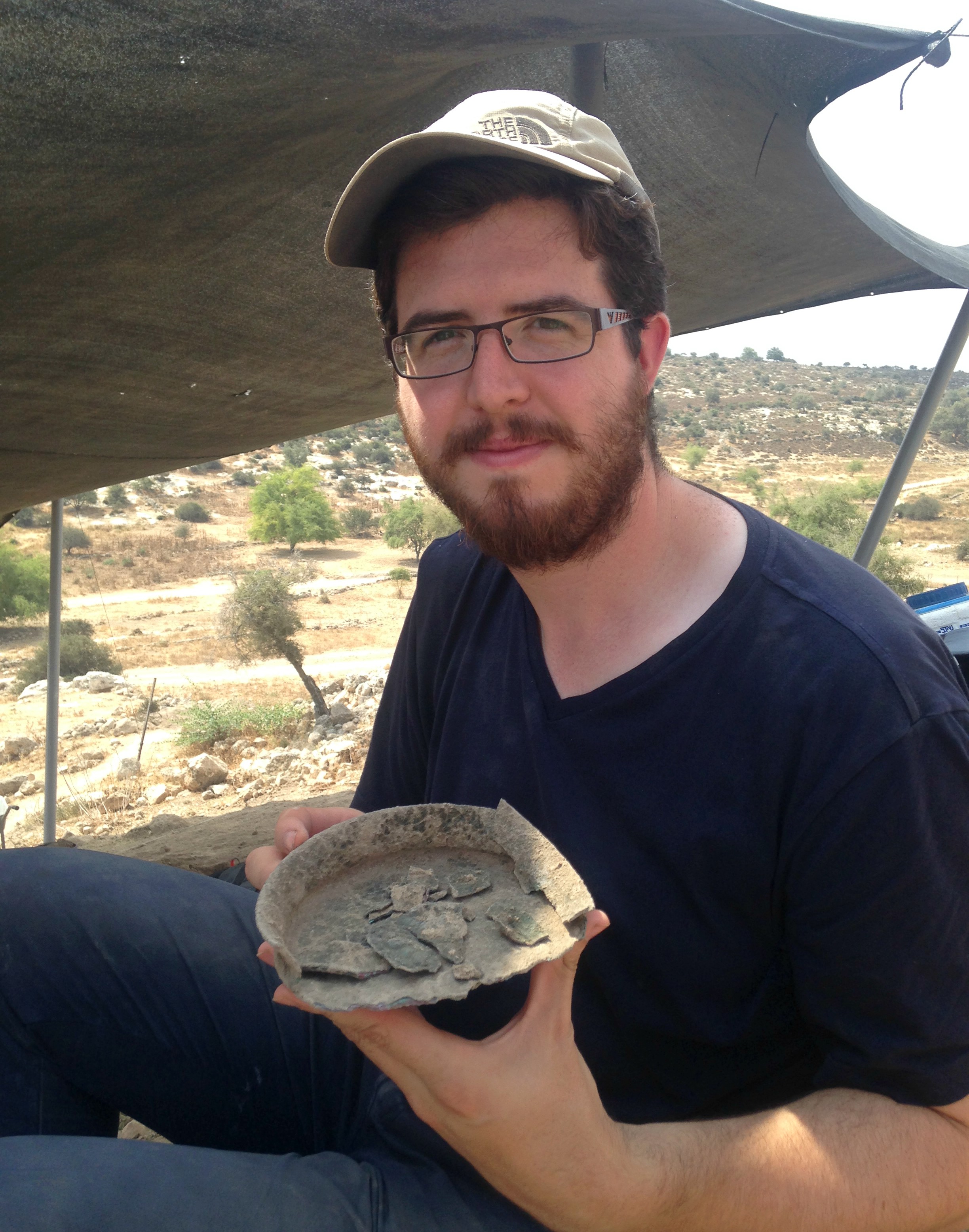 The end of the first week proved interesting as we went on a tour of the Stalactites Cave near Beit Shemesh (to be covered in a different blog post) and spent the night at Ramot Shapira in Beit Meir. The next morning, while scraping the dirt away to define the dirt shelf we had made to work our way down through the topsoil, I made an interesting discovery. My trowel struck metal and, working my way carefully around it, I realised that there was a vessel of sorts laying upright on its side. Because we were still not that far down, it was the general assumption that whatever we found was either modern or old but washed downhill and therefore out of context. So, assuming that it was modern, this largely-intact vessel was removed and examined. When Aren came over he examined the vessel and got visibly excited, telling us that it looks like an bronze bowl of Assyrian or Phoenician design from the Iron Age (3000 years old or so). It got even more exciting when we added that we found a metal disk of the same or similar material with a rosette motif the day before. After the fun in-field talk of ancient metal vessels, we carefully packaged the pieces as instructed and gave them over to Aren to take to a lab in Jerusalem later that day. I recently popped into the Tel es-Safi lab on campus to see if there’s any news on the bowl but, unfortunately, no word yet.