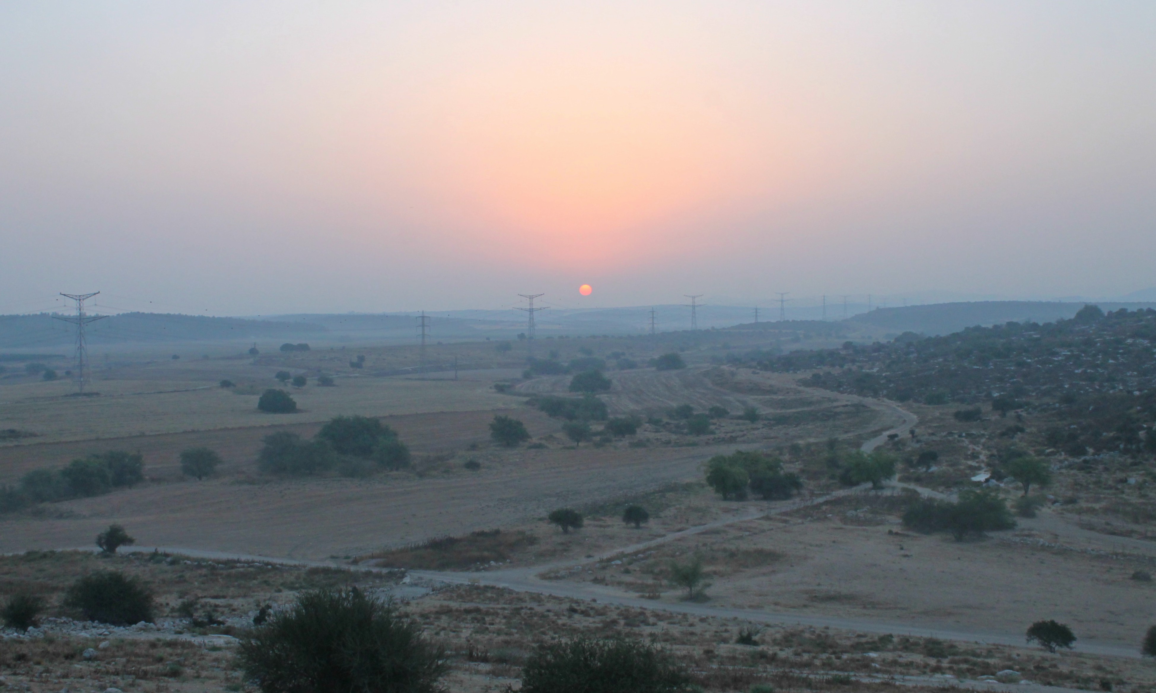 The next morning, before the sun’s rays peeked over the horizon, we boarded the bus and were driven to Tel es-Safi some forty minutes away. With dawn breaking, we examined the white chalk-paneled hill as we approached from the north, one bus stopping at the Lower City areas and our bus continuing around the eastern side of the tel to dispense us beside a Bedouin sheep and goat enclosure. From there we took the tools that we needed and walked towards our area, just downhill from Area E, run by Prof Haskel Greenfield of the University of Manitoba. A marked satellite photo of the dig sites can be seen HERE, with Area J just to the right of Area E. The very first day we were a small crew: Jill, Itamar and myself with two YU students, Meredith and Moshe, and a volunteer from South Africa, Suzanne. A third YU student, Rebecca, was en route and joined us shortly thereafter.