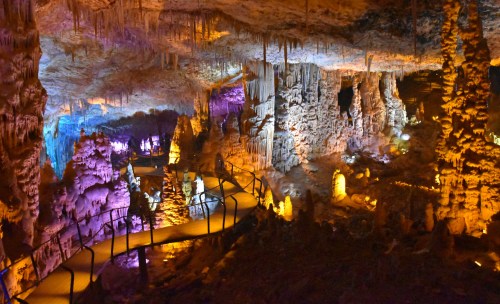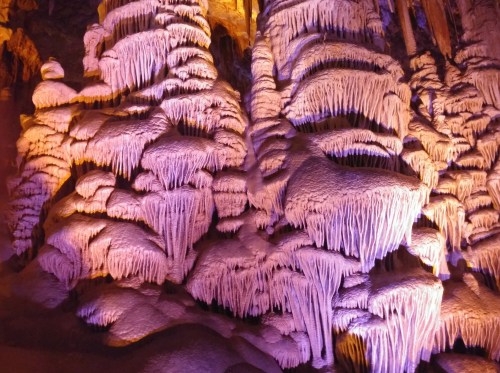 One might wonder why the cave is illuminated in coloured lighting, as did I, and the answer couldn’t be simpler. Traditional white lighting brings out blemishes and undesirable aspects, such a the growth of algae, so the coloured lighting not only hides the bad, but brings out the good in giving pieces their own identity. Another cave that I remember being lit with coloured lighting was the Carmel Caves, and at last I know why.