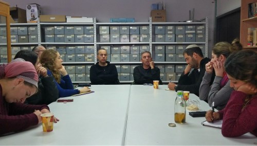 Inside and upstairs, gathering around a large table, we were given a short talk about the history, techniques and struggles of the IAA’s endeavours in safeguarding the nation’s antiquities. The speaker, Dr Miki Saban, is the warehouse’s director and followed up his talk by taking us into the adjacent storage room, where thousands of articles are stored. From this side room we were taken back downstairs and into the cold main warehouse, where rows upon rows of large, sturdy metal shelving units awaited us. Divided by time periods, we instinctively wanted to explore unhindered, but we were visiting with a purpose. We were to be seeing early pottery vessels, from the various prehistoric periods as well as Early Bronze, and were ushered into the proper rows accordingly.