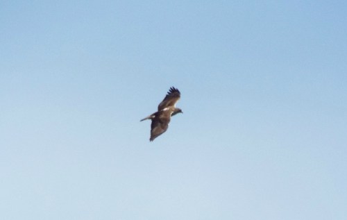 The vulture circled again and again, yet refused to land. Blue rock thrushes, chukars and rock hyraxes provided entertainment in the interim, each engaged in their own pursuit of happiness. Birds of prey overhead also brought us joy, especially a lesser spotted eagle and a juvenile short-toed eagle. But the vulture refused to land.