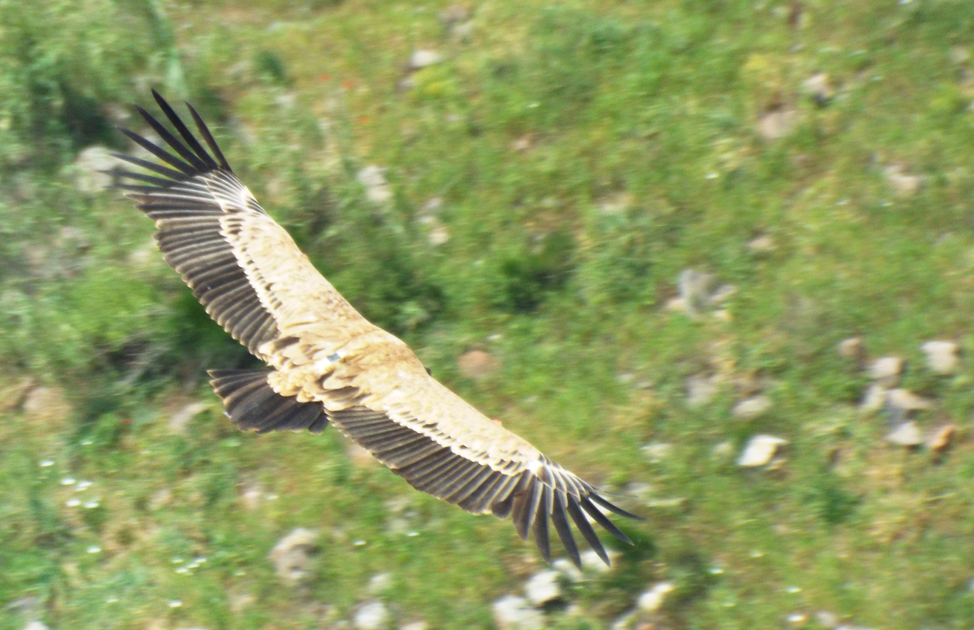 Overhead, we managed to spot a large number of specks in the sky and, with the aid of our zoom lenses, we identified them as a flock of white storks. Mixed in with the storks, but at a slightly different altitude, we spotted a dozen or so black kites. Returning to the cliffs, an Egyptian vulture made an appearance, followed by another Griffon vulture. Together they soared, patrolling the cliff-sides as we watched and took pictures.