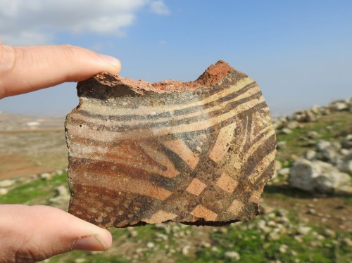 We continued on to the more ruins slightly to the north and gazed down at the Roman era hiding complex that we couldn’t enter due to safety and insurance reasons. Scattered around the area were many potsherds, some of them painted and dated to more recent Muslim periods (Mamluk and Ottoman). One fine sherd was nicely glazed and believed to belong to the Crusader period – which interested me greatly. And then there’s this large piece that’s either dated to the Crusader or Mamluk period: