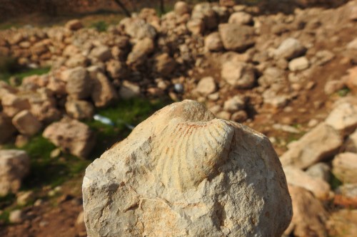 Pulling over at the side of the road some twenty minutes later, our bus dropped us off near an obscure archaeological site called Khirbet el-Marajim. After a five minute walk, and we were at the outskirts of the site, one of the sharp-eyed members of the class picked something off the ground: a rock with a trigonia fossil.