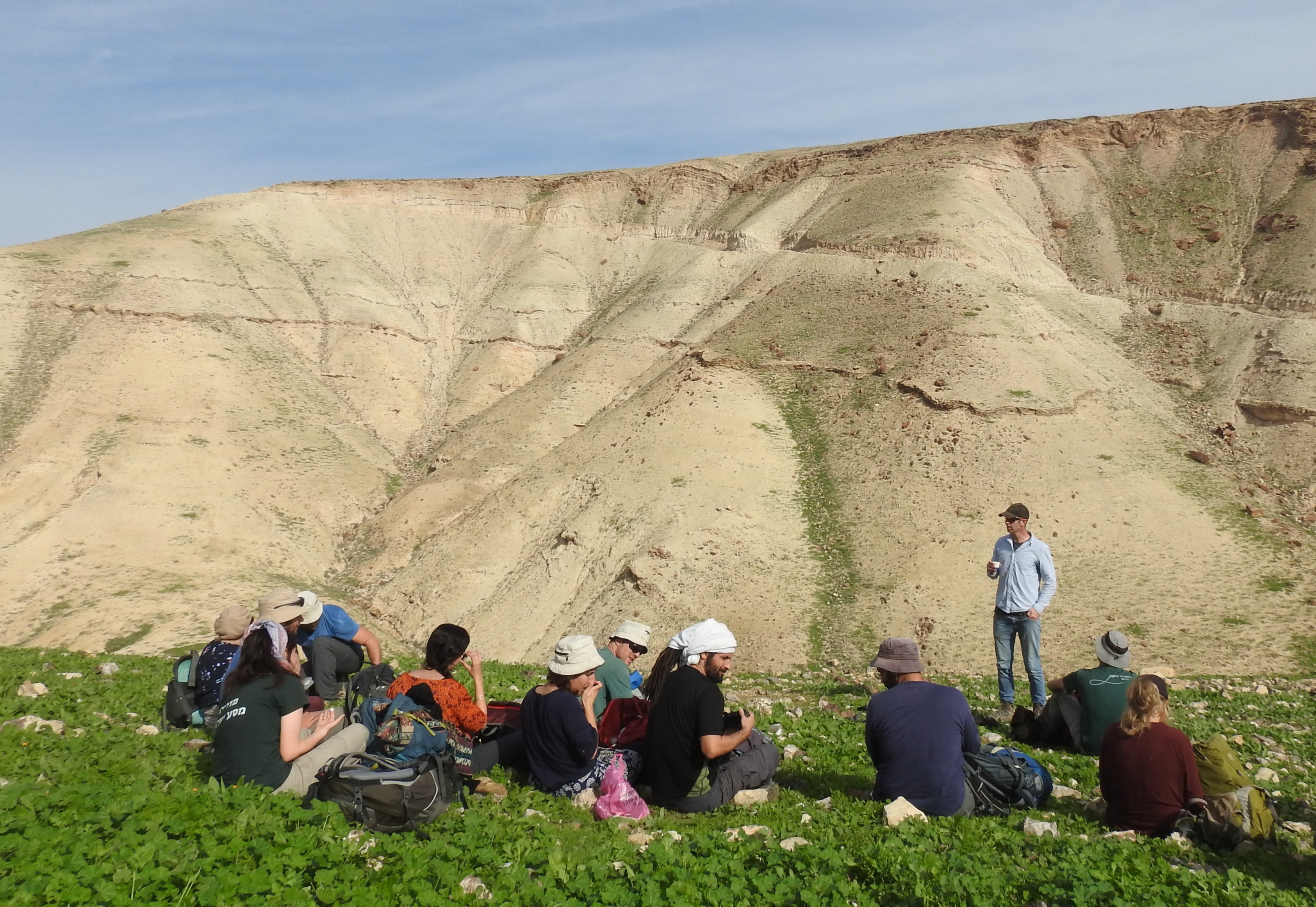 We set off heading southwest, towards the low mountains and in the direction of Wadi Dalia, enjoying the warm air of the valley. Within fifteen minutes we reached the dry streambed of Wadi Dalia and settled down for the first of many field-lectures delivered that day by our guide, Dr Dvir Raviv. Given the necessary background information on the geographical geology, including the changes in bedrock formations from the valley to the mountains as the elevation climbs.