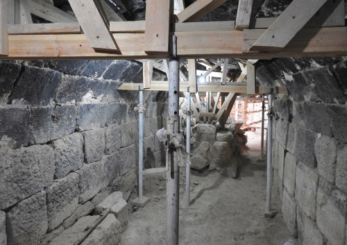 We climbed the hill via the footpath, and entered the fortress complex from the western side, passing various archaeological features and the view of Lower Herodium along the way. The palace remains came into sight as we crested the slope’s top, entering into the ancient courtyard. Raindrops had begun to fall, and we were ushered into the belly of the palace-fortress, entering chambers generally off-limits to the public until the restorative work in complete. Roi Porat led us down a perilous staircase, and into a quaint vaulted room where we set down our bags and got comfortable.