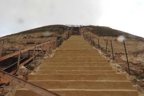 We exited via the tunnels and began to explore the slope ruins, but first, a Finsch’s wheatear popped into view and I snapped a handful of sub-par pictures before it flew off. Walking the slope path, we came upon the theatre which once hosted great entertainment during the Herodian period. Next, the two sets of ancient steps that head up the slope towards the peak, each built in a different time period.