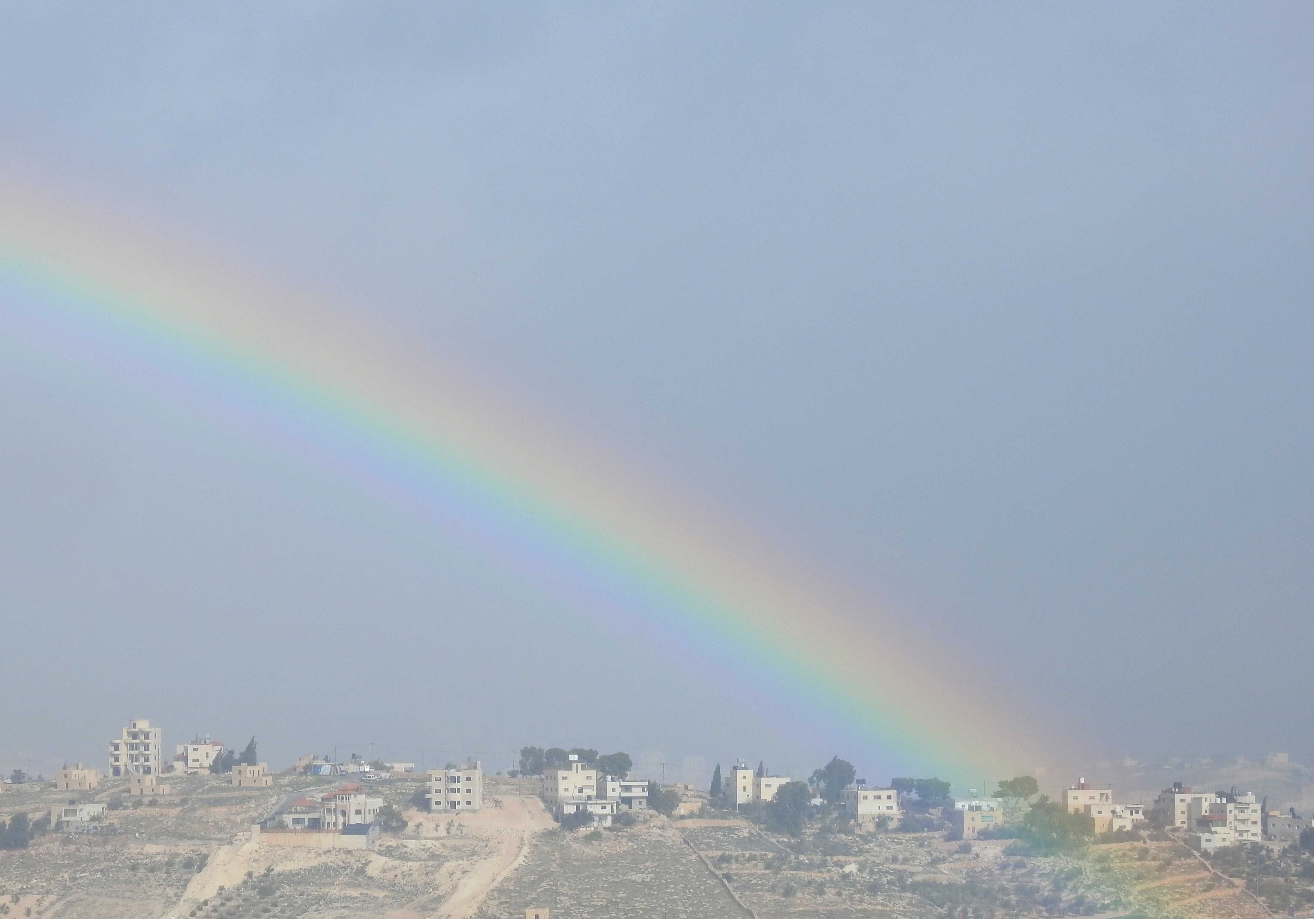 Properly briefed, we then headed outside and made our way to the hilltop northeast of Herodium. It was chilly, with rain clouds in the distance, but a full rainbow appeared before us and life was looking great. We were divided into two teams, each tasked with scanning a particular area for potsherds and other archaeological evidences.