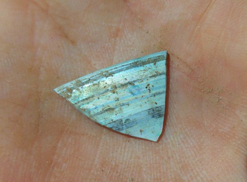 Every now and again a coin would be found – never by me, unfortunately. However, I did find a nice piece of a mould-made oil lamp with an ornate pattern that looks like bent palm trees forming arches, encircling the pouring hole. Shortly thereafter, once the excitement had died down, another two pieces were found – one being a match, and one from a different lamp.