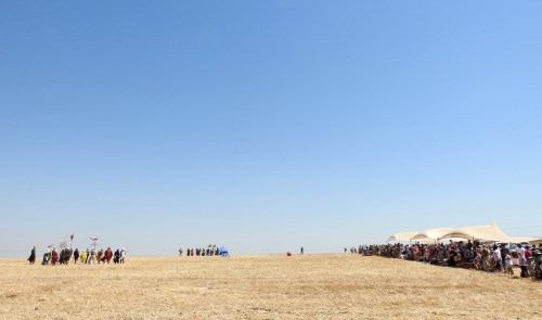 My brother Nissim and I set out the morning of Friday the 5th, aiming to intercept the march where they reach the Horns of Hattin. Quite near the site we picked up another history buff who had come to see the reenactment as well. We parked in the designated field at the foot of the mountain and joined the hundred and something spectators who were gathered about beneath shade tents.