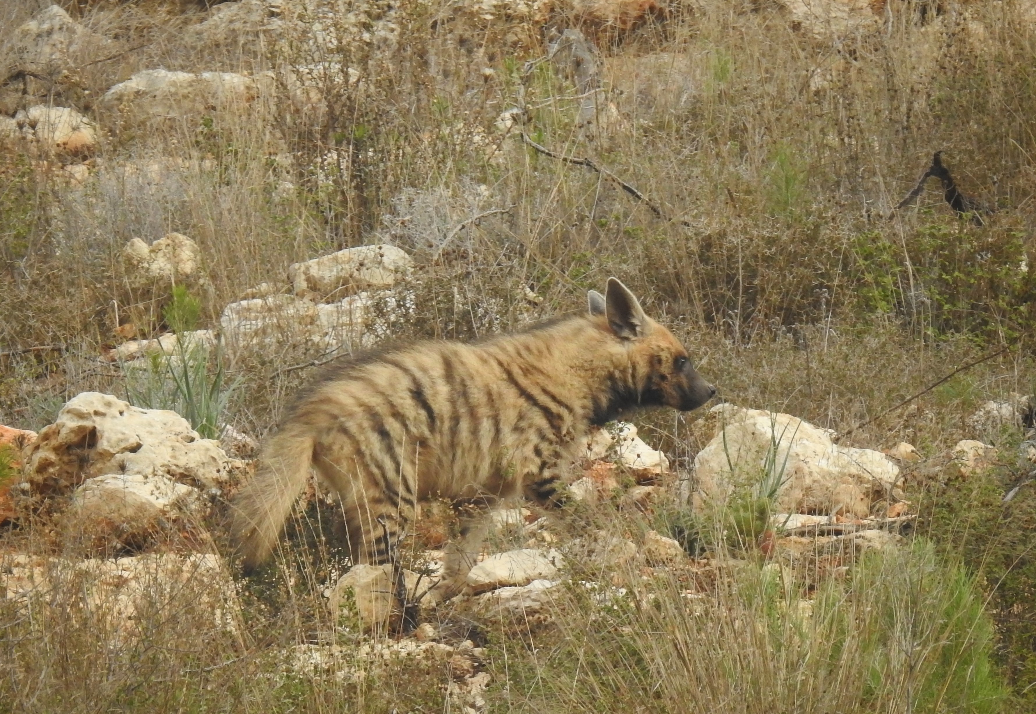 As we walked, Avner pointed out a few gazelle on the slopes in front of us, and sure enough the trailside slopes had what to offer. It happened so quickly, and so very unexpectedly. I saw a head peering out from behind the rocky vegetation, and immediately, instinctively knew that it belonged to a striped hyena.