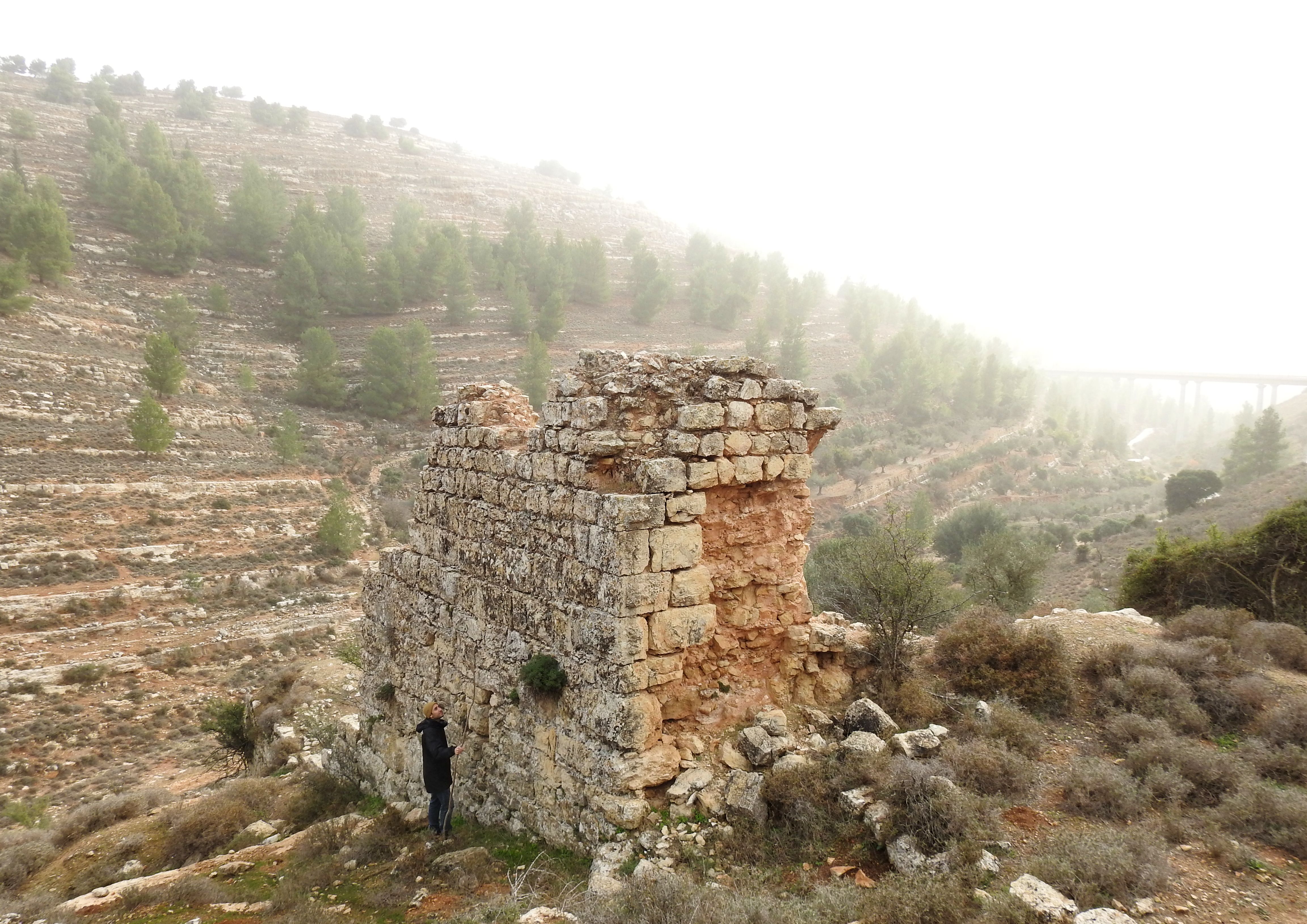 Avner picked me up in the morning and we drove over to our first destination, Khirbet Luza (or, al-Lawza), located not far from Moza. With a quick stop for coffee we made it to the nearest parking lot, at Arazim Valley Park, and continued on foot, all bundled up from the cold.