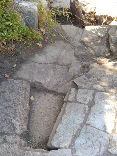 Leaving the trail, we climbed up on the damp rocky soil terraces, noticing the abundance of Steven’s meadow saffron, the delicate pinkish-purple flowers popping out of the soil. We explored the lowest level of the ruins, a large square chambre with thick walls, believed to have served as a pool of sorts.