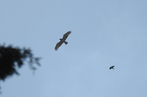 Jackdaw mobbing a short-toed eagle overhead