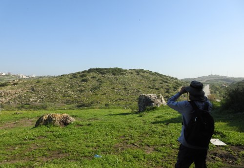 Interestingly enough, the transition from woods to open scrubland is exactly where the Green Line was drawn, way back in 1949. Today, a huge bridge follows that same line, part of a new traffic rerouting project. Once in open territory, we scanned the surrounding rocks for interesting birds but found mostly Eurasian jays and chukar partridges. At last, as we progressed through the dew-soaked grass, we spotted a long-legged buzzard perched on a treetop further up ahead.