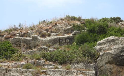 Dropping down from the elevated sandstone ridge, we scanned the rock walls from the east, looking for the cryptic letters. Much of the rocky area around the fortress was used to quarry sandstone ashlars for construction, so we knew to look for the more natural patches.