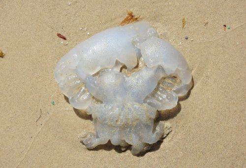 The second discovery was the presence of countless jellyfish washed up on the shore, belonging exclusively to the species nomad jellyfish (Rhopilema nomadica). This species has infiltrated the Mediterranean Sea, having migrated via the Suez Canal. Large and usually a semi-translucent white, these jellyfish have become quite an issue every summer and whilst we were not pleased to see their presence, we weren’t completely deterred. Slathered with sunscreen we braved the potential of stinging jellyfish and entered the surf bravely. Sure enough, we each began to feel the stings and while we could usually see them drifting about, the repeating waves concealed them and it was inevitable that we should feel their jellied tentacles. True, the sensation is unpleasant, but in all fairness it’s not that bad, so we stayed in the water and just tried to avoid the jelly beasts as they drifted aimlessly around us, their trailing stingers ever-dangling in search for prey.