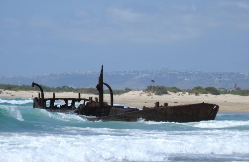 Heading straight for the sea, passing a small tributary which would empty into the sea had there been more water, we made two interesting discoveries. The first was that we had landed exactly where the “famous” shipwreck is, the subject of innumerable sunset photographs, which turned out to actually be quite small. Where I had always envisioned a small ship, of impressive proportions, there lay a small boat which was a bit underwhelming. A little research revealed that this boat is believed to be a Turkish cement-carrying ship that somehow sunk, but in fact it seems that it was an Israeli fishing boat named “Netz” that sank during a storm in 1970. The boat was left in situ, and has slowly decomposed, but more pictures can be seen HERE, on an interesting Hebrew blog. Also, a very neat aerial shot can be seen HERE.