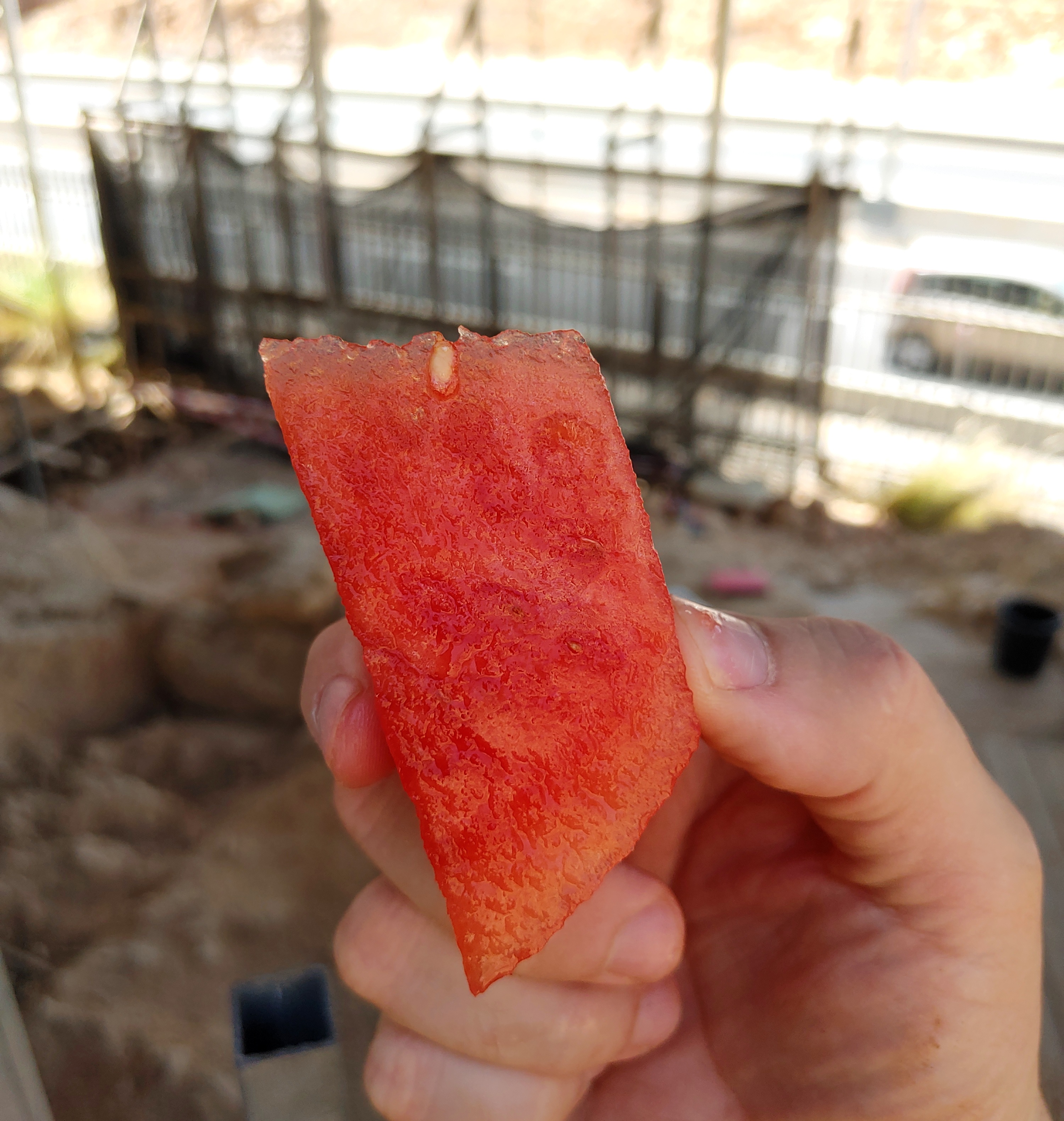 Getting up from the artefact washing, we broke into a juicy watermelon – the quintessential summertime archaeological excavation snack. Upon having our fair share of the sweet fruit, I shifted back into a sifting role and enjoyed sitting in a chair once again. That went on for twenty minutes or so, and included a visit by some representatives of the Israel Antiquities Authority, until it was time to start packing up.