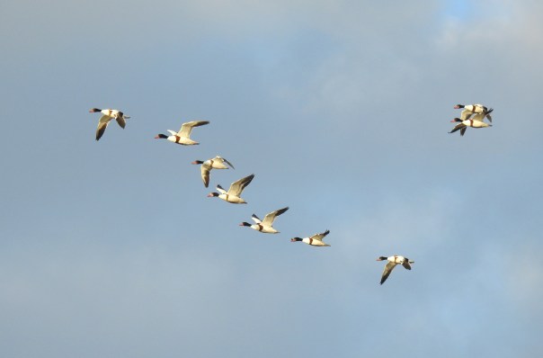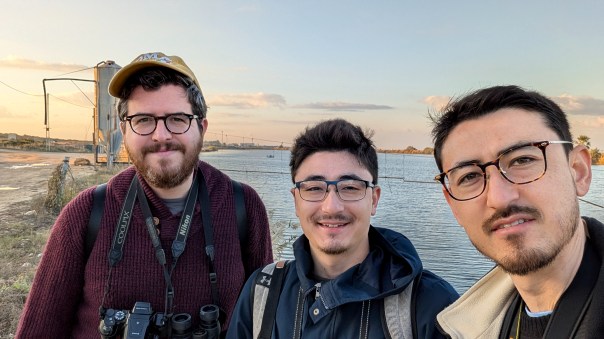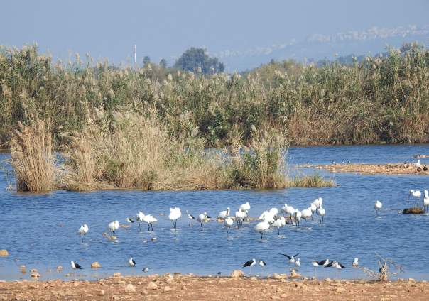 A small group of flamingos were spotted flying about to our right, teasing us with their striking white and pink plumage. Matthew suddenly called out “Shelducks!” and pointed up at the sky to a flock of a dozen of so shelducks in a loose V-formation. The last time Adam and I had seen shelducks was years ago in the Yavne infiltration pans, so this was a very welcome sighting. As quick as the shelducks appeared, they were soon gone and we found ourselves ringing out bird species as we spotted one after the next in quick succession. A flock of snoozing pied avocets also gave us joy – not the most common wader to find in Israel.
