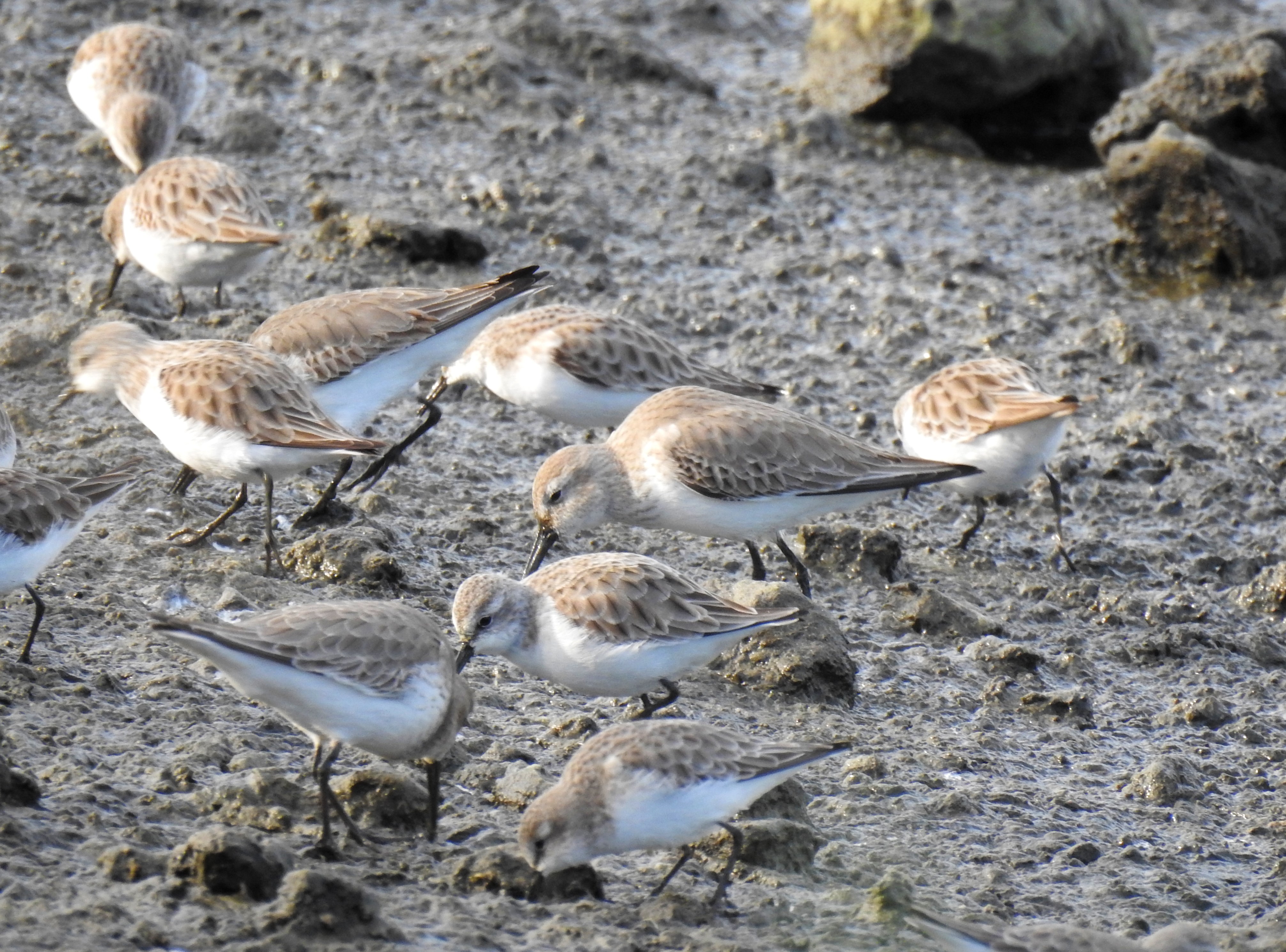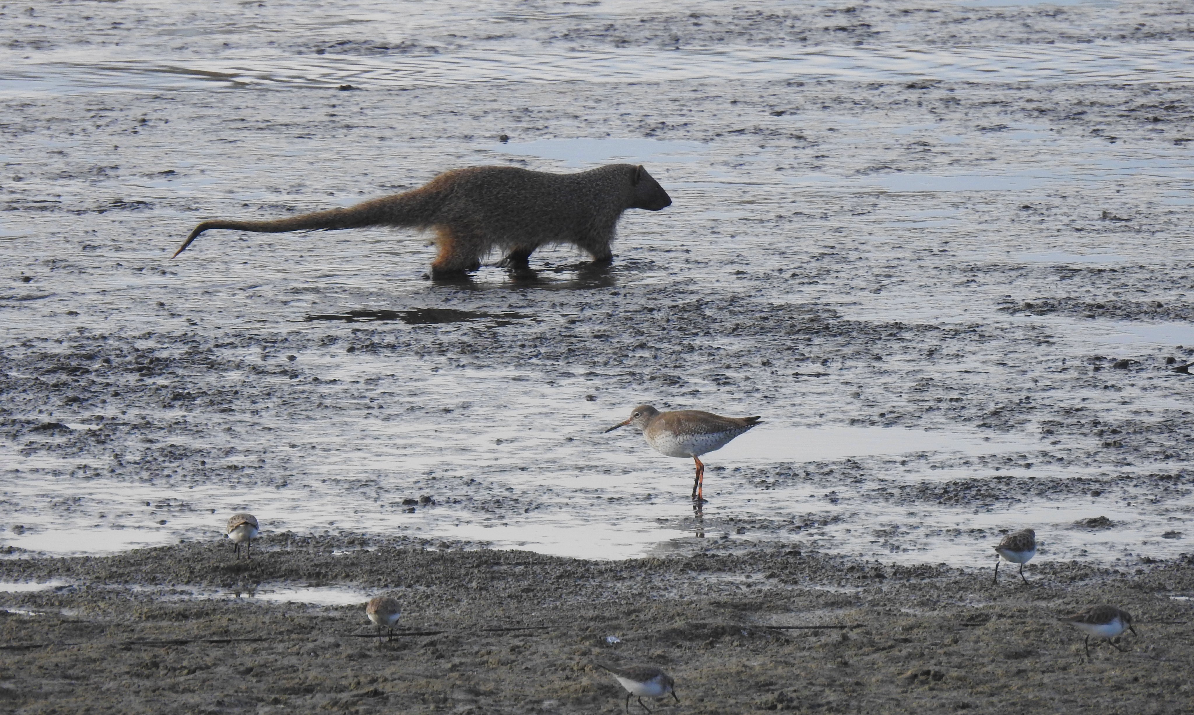 We then made our way to the sandy coastline, just a few steps past the end of the final fish pond. We spotted a few more mongooses as we made our way down to this tiny natural pond and a water channel that snaked its way through the sand to drain into the sea. Here I was hoping to see some delightful sea birds, or at least some interesting gulls and terns, ideally even new species. Yet, the skies were as empty as the beach, with nary a bird to be seen. Refusing to give up, we ambled about a bit and rustled up some gulls far off on the beach to the north, as well as some ringed plovers resting by a distant piece of driftwood.