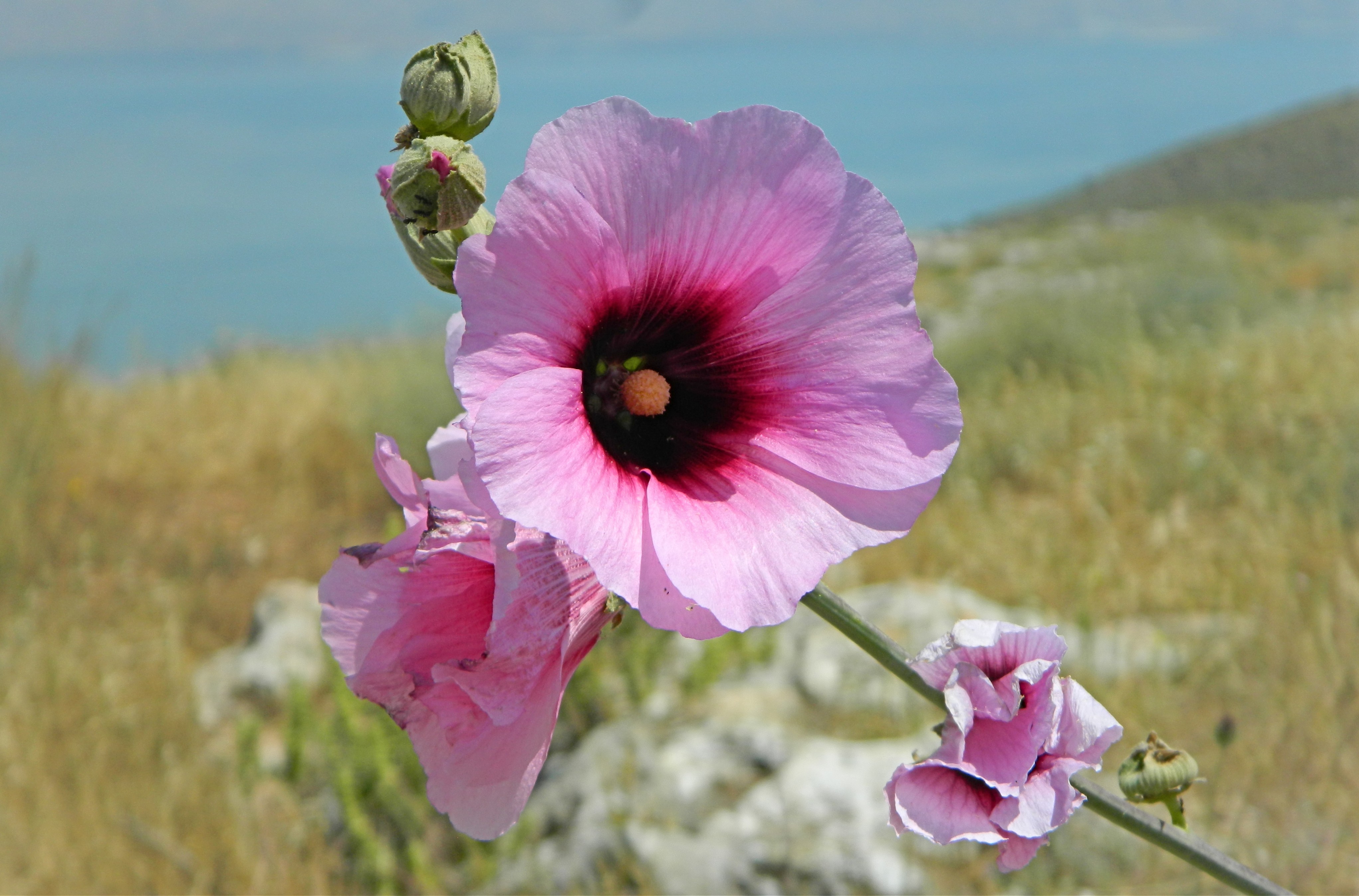 After passing some blooming hollyhocks and a large amount of Levantine marbled white butterflies feasting on sweet thistle nectar, we reached the trail’s descent from the peak. Here progress was slow, and I scoured the cliffsides for interesting wildlife to no avail as I awaited my turn to make my way down the stepped path. The trail curved back in the way we came, and we headed westward along the slope.
